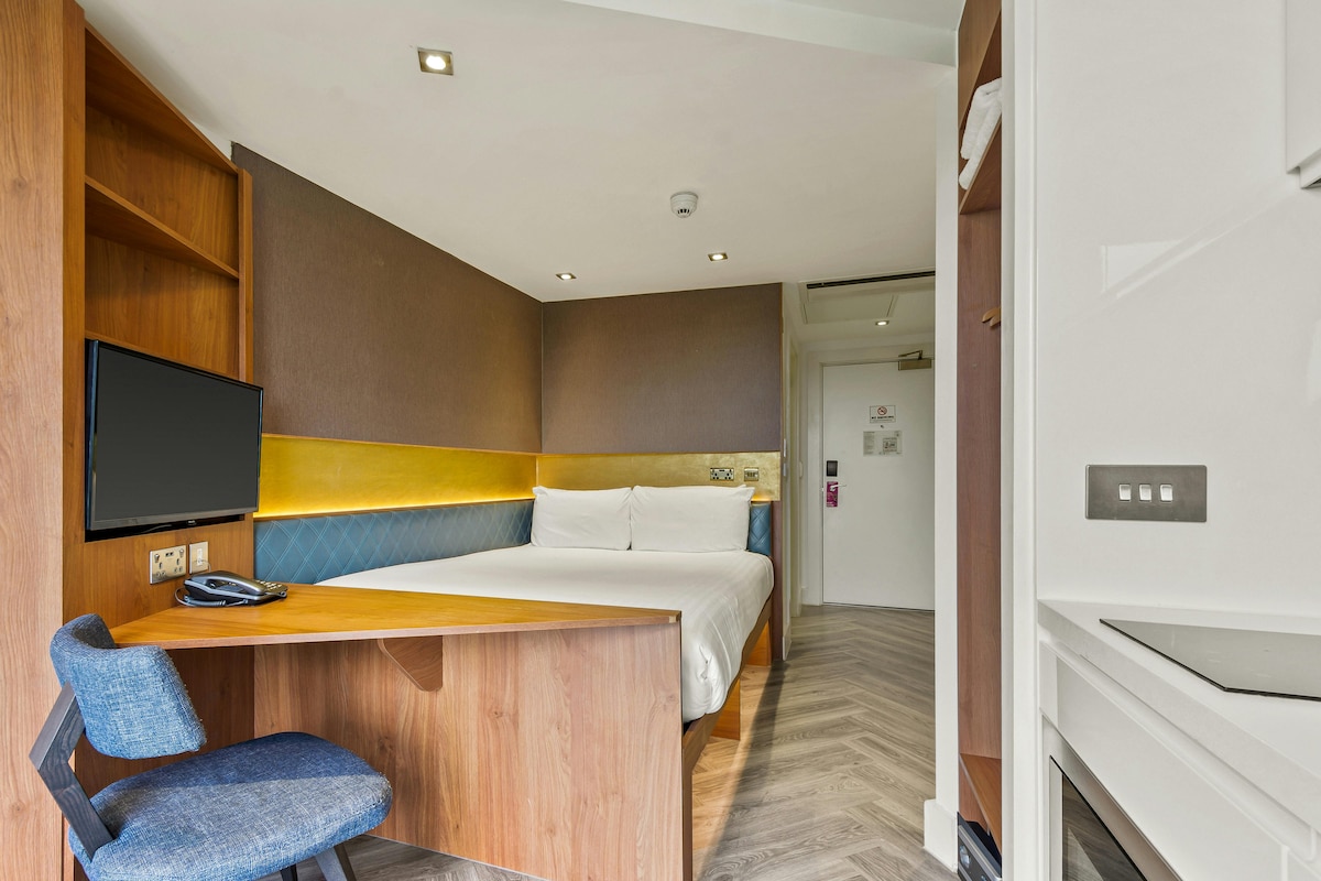 The Neo Studio at Roomzzz Stratford offers a spacious and thoughtfully designed space, perfect for extended stays or added comfort. Spanning approximately 17 square meters, it features a plush double bed, a sleek en-suite bathroom, a fully equipped kitchenette, and a dedicated workspace. The modern layout combines style and practicality, ensuring a relaxing and luxurious experience.