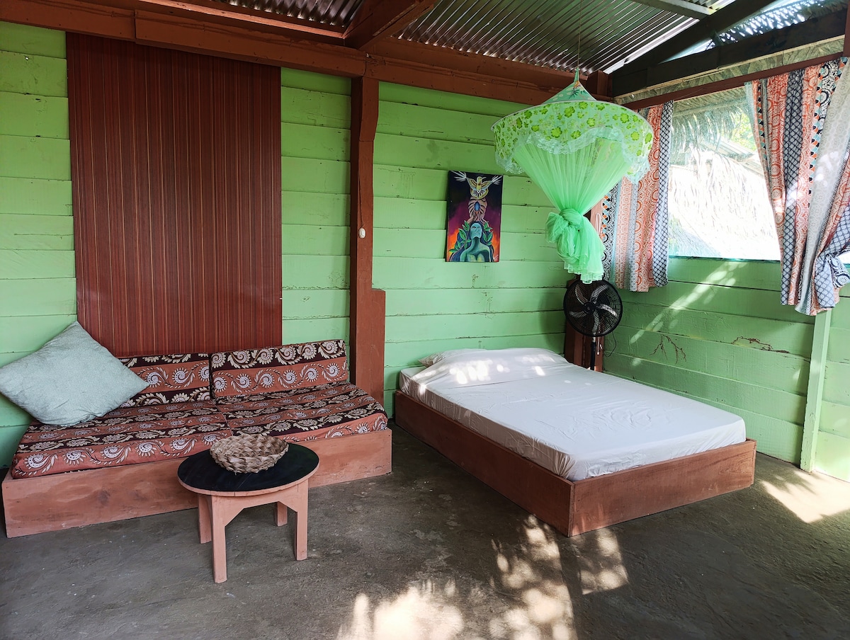 This two-story house has a beautiful view of the jungle garden and river, with a family of monkeys passing by daily. Comprised of two floors, this cozy house has a patio off the upstairs bedroom (with a double bed) where you can sit and enjoy the view. Downstairs is a dedicated workspace, and with access to high-speed internet, you'll be able to work from this beautiful jungle abode or watch a movie on the couch in comfort (the couch can also be made into a bed to accommodate one extra person).