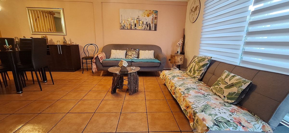 Disfruta de la sencillez de este alojamiento tranquilo y céntrico. Departamento amplio y luminoso, cuenta con dos dormitorios, 1 baño, living comedor, terraza, cocina completa y equipada, wifi, Tv (Netflix, youtube) aire acondicionado, capacidad para 4 a 5 personas. Cerca de cerro para trekking, supermercado, ciclovía y áreas verdes. Entorno seguro, portería durante el día, acceso restringido durante la noche. *Departamento ubicado en 5to piso con excelente vista. *(No cuenta con ascensor)