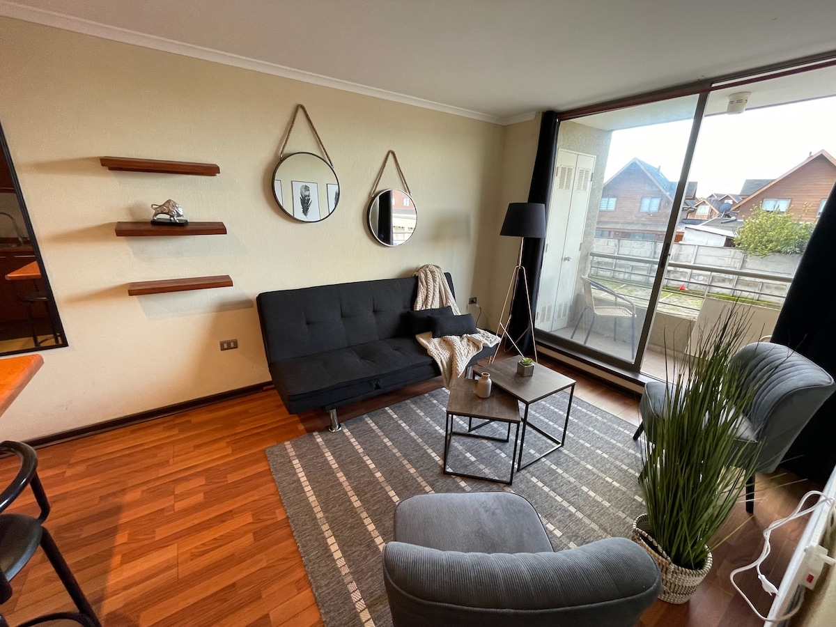 Disfruta de una estadía inolvidable en nuestro Airbnb. Nuestros servicios incluyen: Wifi, aire acondicionado, sábanas y toallas. Estacionamiento subterráneo, área de juegos infantiles. Ubicado cerca de supermercados, clínica, pubs, restaurantes y a 5 minutos del terminal rodoviario en auto. Locomoción colectiva a media cuadra.