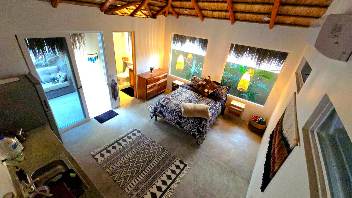 Recently constructed Casita with palm frond roof, concrete floors and walls. The structure backs up to a nice cliff with lots of birds in the area. It is private & peaceful. There is a pool and hot tub. Starlink for WIFI. Washer & dryer are opposite the casita. The Casita is next to our home but is very private and quiet. Situated in a rustic neighborhood with a dirt road. Often goats and cows walk by, the neighborhood is very safe and quiet at night. Come and enjoy this amazing oasis.