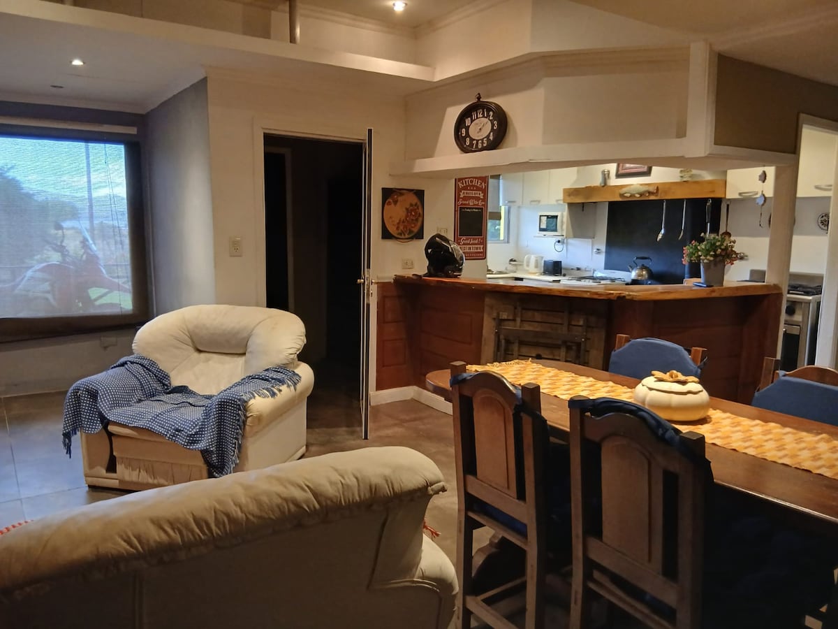 Relajate en este alojamiento único y tranquilo rodeado de bosque nativo. 130m2 cubiertos distribuidos en dos plantas con impactantes vistas. Cochera cubierta, parrilla, hogar de leños, Wi-Fi de alta velocidad por fibra óptica. Dos baños (el principal con hidro), cocina totalmente equipada, dormitorio matrimonial (bow window), dormitorio doble. Deck exterior con parque propio. Piscina climatizada disponible desde el 26/12/2025 al 31/03/2026