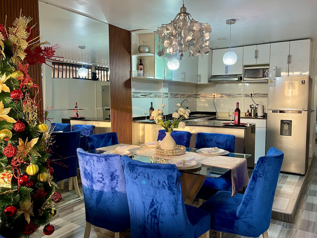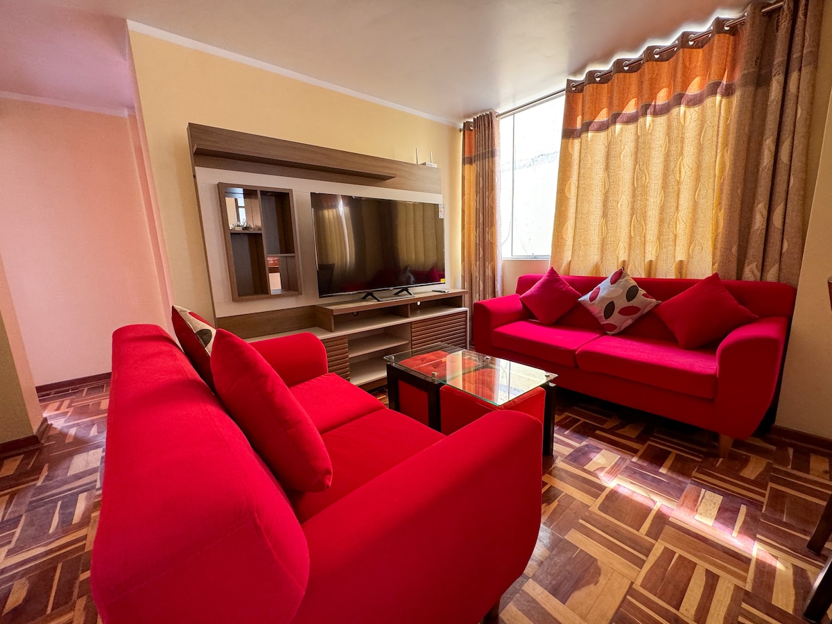 Bienvenidos a nuestro Hermoso, e impecable departamento ! Disfruta de un alojamiento seguro y lujoso, con todo lo que necesitas para pasar unos días extraordinario, al lado de tu pareja o amigos. El departamento ha sido implementado pensando en la comunidad y placer de los huéspedes con equipamiento de excelente calidad. Está ubicado en el 5to piso (no hay ascensor). Disponible lavadora, Está al costado de un minimarket y de lugares cercanos. A 10min del aeropuerto.