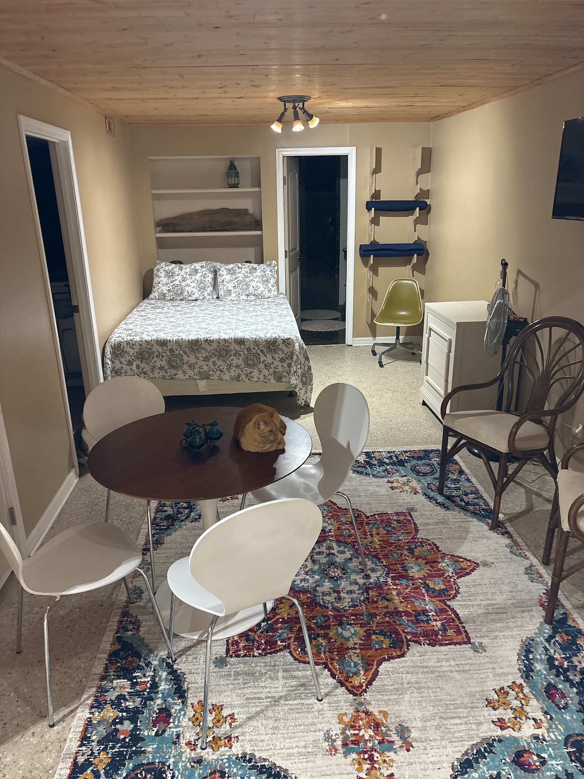 Studio has 9 windows overlooking the tropical garden. Kitchenette with mini-refrigerator, sink. New farm-style bathroom with walk-in shower. Walking distance to Tulane and Loyola. 10-15 minute drive to Superdome, Downtown and French Quarter. Streetcar is a 10 minute walk from the studio. Lush garden with gas grill. This is studio is located in the quiet, family area of Carrollton. No guests under 21, proof of Covid vaccination required .