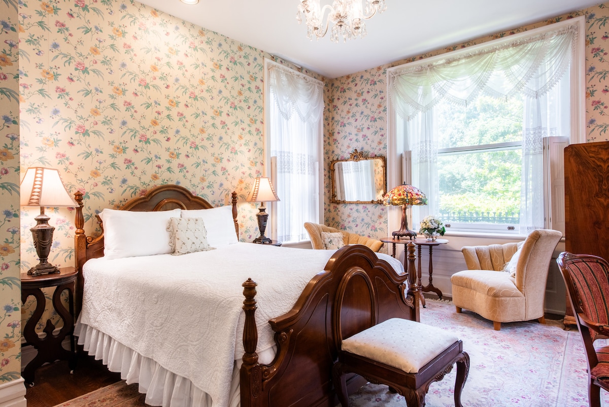 Awaken to a view of Central Park through the grand double hung windows. Room includes a queen bed, two reading chairs, beautiful stained-glass lamps, armoire, and writing desk. The en suite bathroom includes a pedestal sink and full shower. The Park View Room is within the magnificent Central Park Bed & Breakfast. This charmingly preserved and luxurious inn welcomes those seeking a place of stylish comfort, and bespoke service including gourmet breakfast each morning.