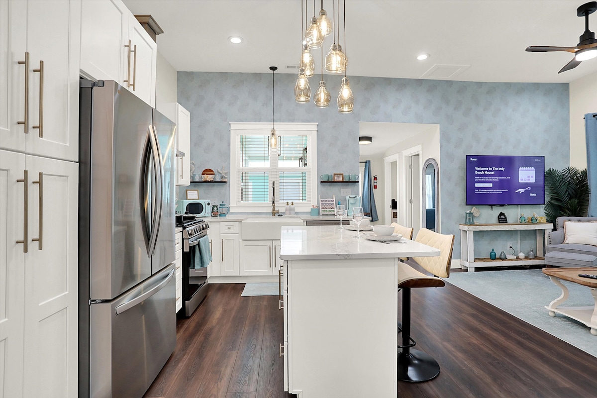 Designers Home "Chateau Noir" Located .9 Miles from Lucas Oil, 1 Mile from Bankers Life Fieldhouse and 1.4 Miles from the heart of downtown! This home features 2 bedrooms one with a king bed and attached bathroom and one with a queen bed and walk-in-closet. large eat in kitchen with attached full bathroom, a second living room with sectional and large tv, deck with area to eat, grill or sit and relax!! This home has it all!