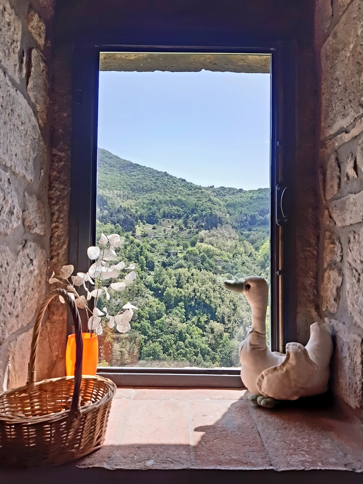 Un paesino medievale, lontano dal traffico e dallo smog, immerso nei boschi e nella tranquillità. Una casa accogliente con giardino, la mattina ci si sveglia con il cinguettio degli uccelli e la vista sulla vallata. La camera con letto matrimoniale si affaccia sulla valle, quella con 3 letti singoli ha la vista sul giardino. È possibile aggiungere un lettino per prima infanzia (sono presenti anche fasciatoio e seggiolone). Cucina abitabile, grande salone. Giardino.