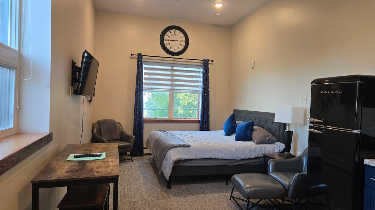 Formerly known as the Feigal’s jewelry workshop, this unit was converted into a spacious and economical unit. A wooded view with a king bed, microwave, mini fridge, Smart TV, telephone, and coffeemaker. Wifi provided. A short walk around our building and you can enjoy our large grassy grounds and ledge rock Lake Superior shoreline. Note there is no view of Lake Superior from this room, and this room is located next to the office.