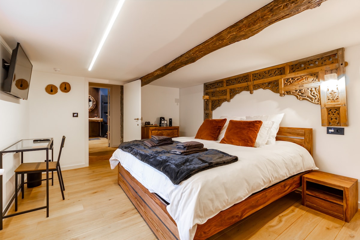 Pour votre information cette chambre a une hauteur de 1m90. Notre maison de caractère vous séduira par son atmosphère cosy et charmante. Elle dispose de quatre chambres dont une familiale dont toutes d'une salle de bain privative. Le salon et son grand feu ouvert vous séduira pour un moment de lecture ou convivial.
