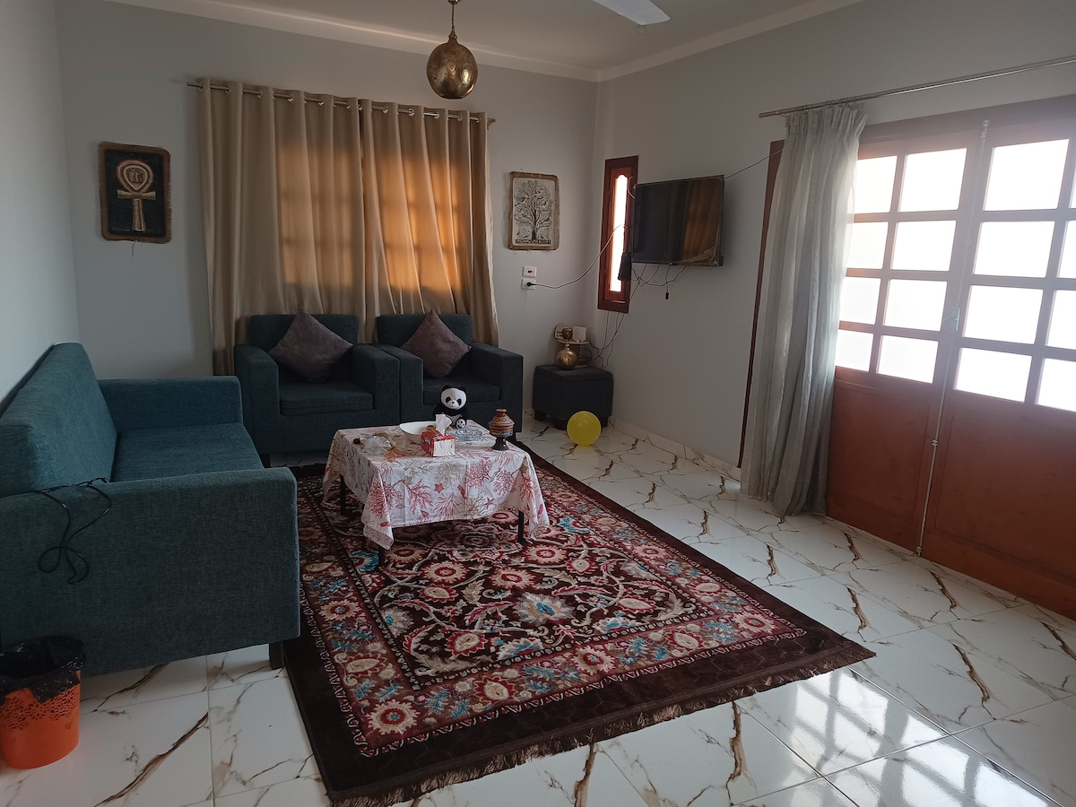 This apartment is located near the Medinet Habu temple, as well as various other historical sites. It is a furnished three-bedroom apartment (only two bedrooms are furnished) complete with cookware, stove, oven, refrigerator. When you walk out onto your balcony, you will see green plantations and palm trees against a backdrop of impressive desert mountains. Due to the low population of the area and the distance from major roads, nights are very tranquil and silent.