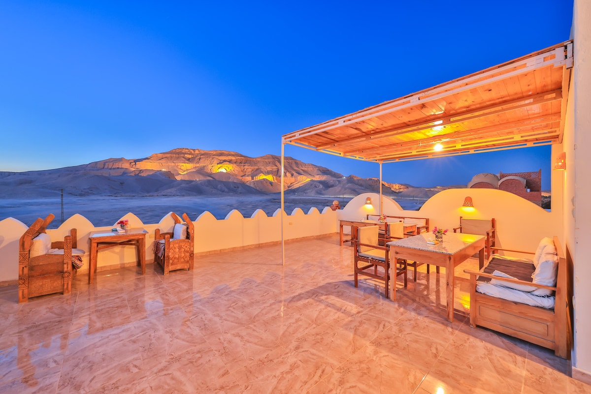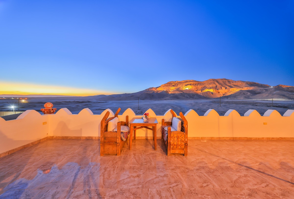 Beit El Hana is located near all the important landmarks such as the Valley of the Queens, the Valley of the Kings, and the Temple of Medinet Habu. Beit El Hana offers a beautiful view of the sunrise and sunset, and you can also enjoy hot air balloon rides in the morning. We also provide a rooftop and ideal vantage point for viewing the 2027 solar eclipse. The rooftop here will be perfect for viewing the eclipse, and there is a space here that offers a breathtaking view of the Valley of the Quee