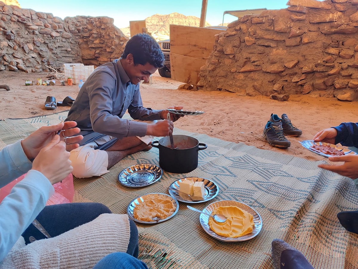 You will sleep with the stars, in our natural private cave of Wadi Rum Desert Protected Area ( or in camp if you wish). With delicious traditional dinner and breakfast. Drink tea, enjoy the nature and silence and MILLION OF STARS: stunning sky! Since there is no bank in desert: extra 50jd paid to Eid after the cave experience in adition to the airbnb charge. Eid Albloe, born in this desert will be your host.He can take you on an authentic desert tour not only to the touristic places but better