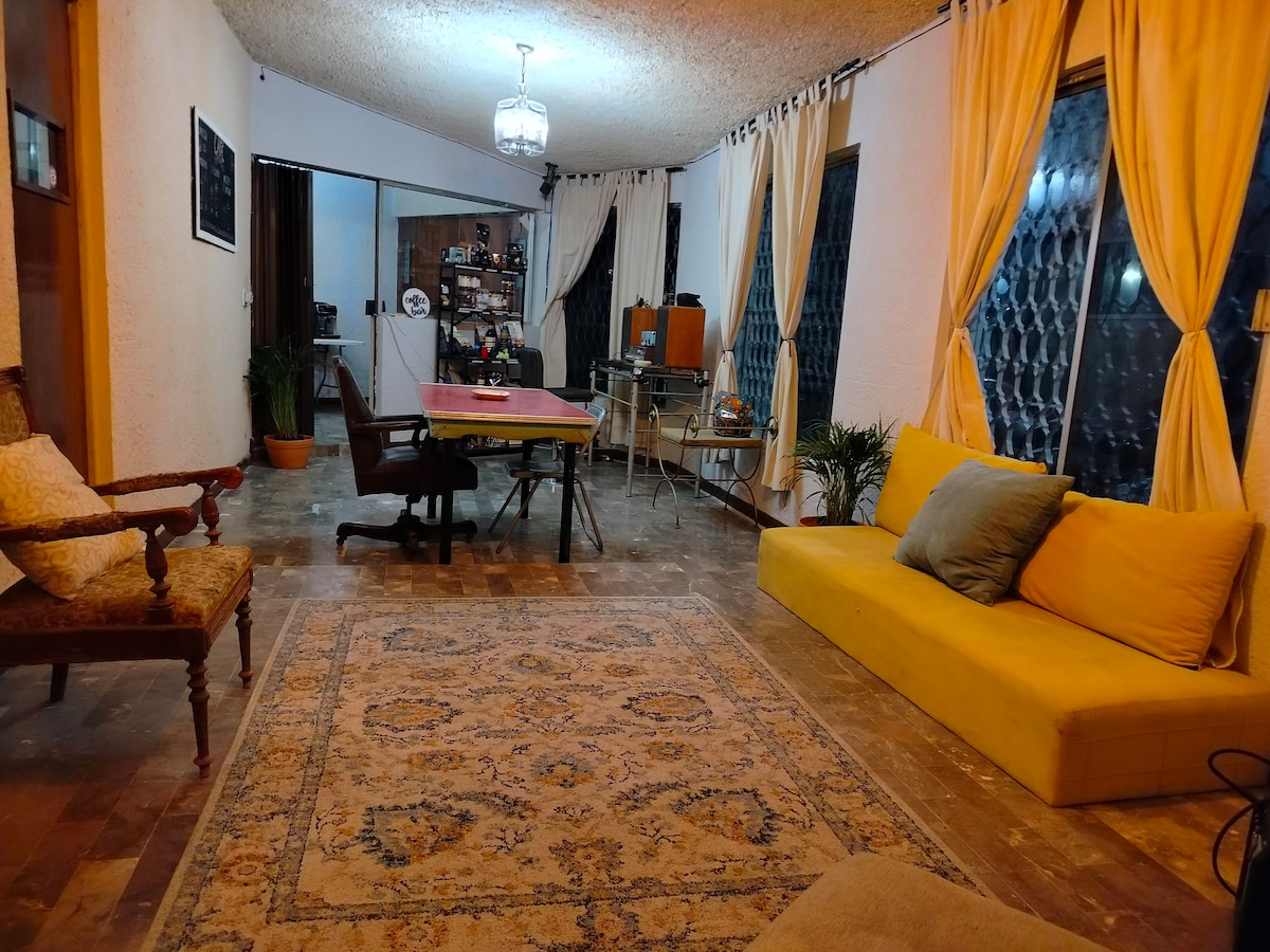 Disfruta de un ambiente relajado con una decoración que combina el arte vintage y moderno. La casa puede estar disponible completa o por habitación.se puede disfrutar de un patio con jardín y una amplia terraza von vista al cerro de las mitras y la ciudad. El tercer piso tiene un cuarto/sala abierta con acceso a una terraza grande, con muebles de exterior (mesas, sillas, camastros, asador). El tercer piso tiene 1 baño completo y sofá/camas donde pueden dormir 3 o 4 personas. Refrigerador.