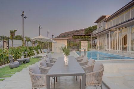 Eldora a luxurious 5-bedroom villa in Karjat. Imagine yourself sitting by the lake, sipping your morning coffee as the sun rises over the water. Tucked near Morbe Dam, this 5-bedroom pet-friendly villa is all about peace, comfort, and nature. Wake up to bright, airy rooms surrounded by greenery and sleek, minimalist design. Whether you're lounging by the private pool or sipping coffee with the sound of nature in the background Eldora isn’t just a getaway, it’s escape you didn’t know you needed