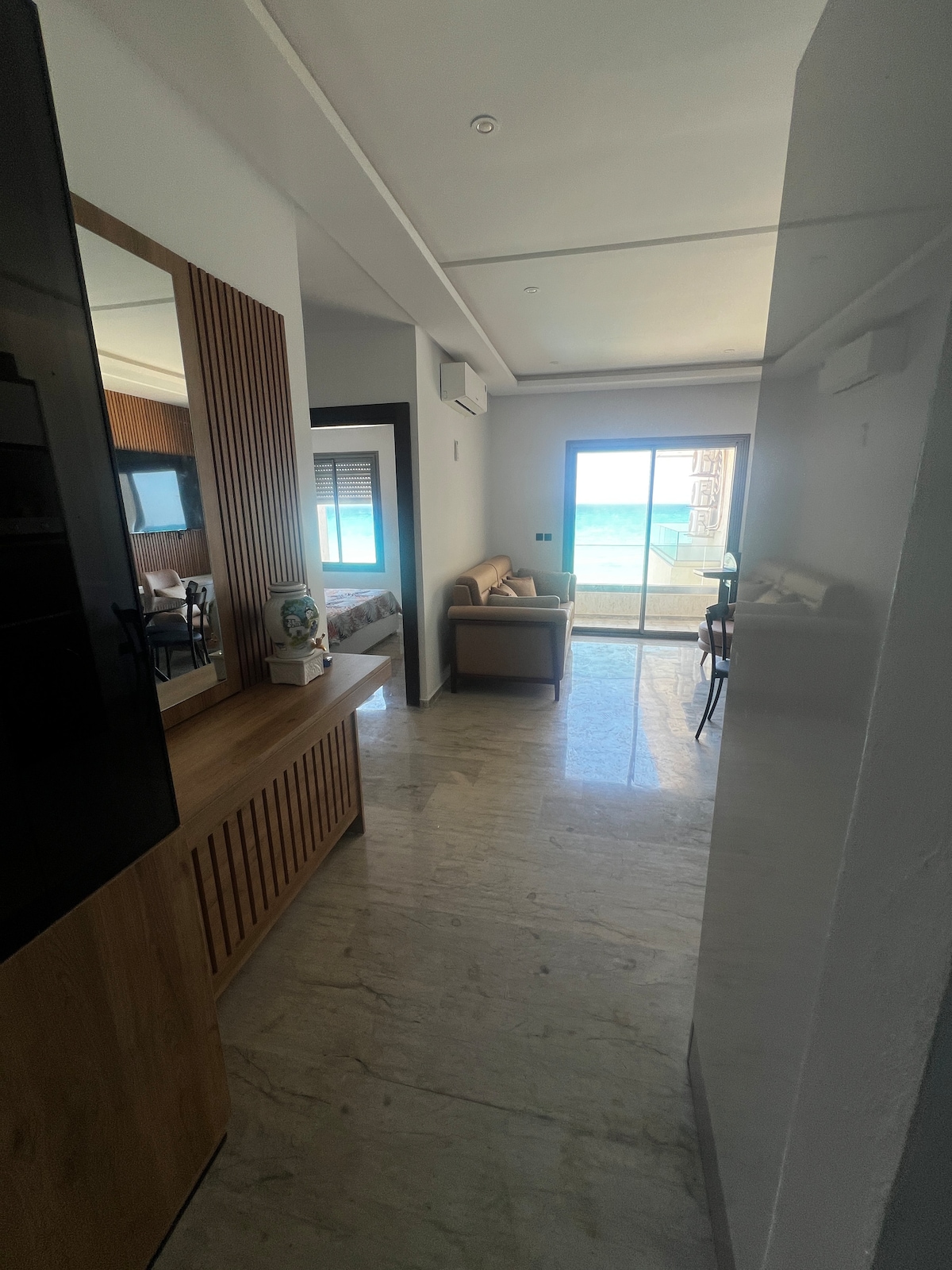 Face à la mer . avec terrasse vue imprenable. 2 chambres salon. sdb et cuisine. Salakta est une ville populaire de la Tunisie, une ville simple et belle pour des gens pas compliqué. idéal famille jusqu'à 6 personnes adultes et enfants . activités piscine musées randonnées pêche excursions plage jeux.