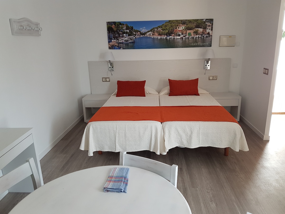 In Cala Agulla, the apartment in a hotel Standard-Apartment 19 with step-free access and interior boasts an excellent location close to the beach. The 30 m² property consists of a living room with a sofa bed for 2 people, a kitchen, 1 bedroom and 1 bathroom and can therefore accommodate 2 people. Additional amenities include high-speed Wi-Fi (suitable for video calls), a TV as well as air conditioning. On top of that, a shared sauna is also provided for your enjoyment.