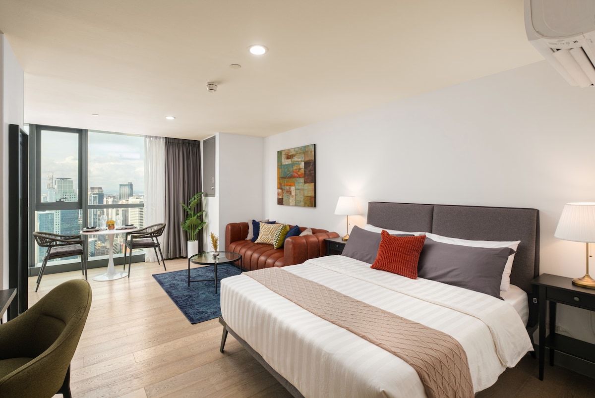 The business traveler's suite is a thoughtfully designed space tailored for executives and young professionals seeking comfort and convenience. This modern suite offers a perfect blend of style and functionality. The space features a hotel-inspired bed arrangement with modern, elegant and crisp linens, plush pillows and luxurious duvet for a perfect night's sleep. It also highlights a window nook, which is a perfect spot to sip coffee or read a book while soaking in the Makati skyline.