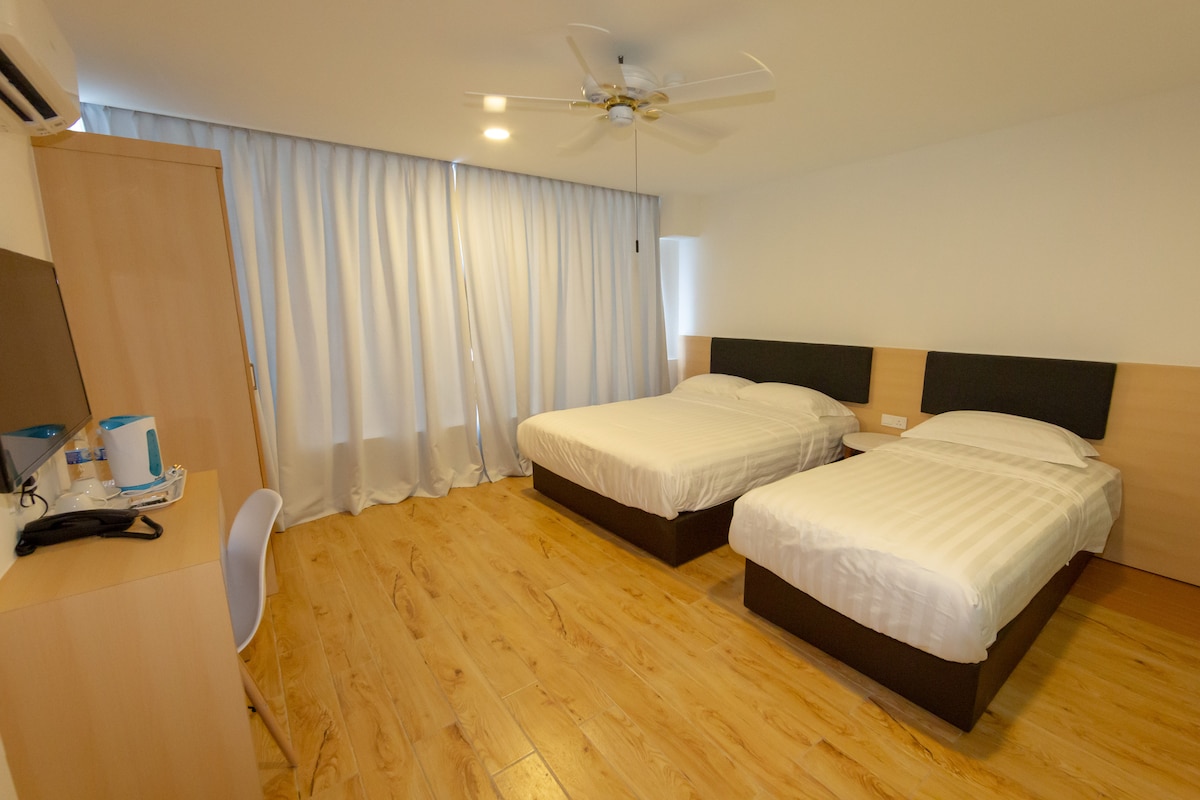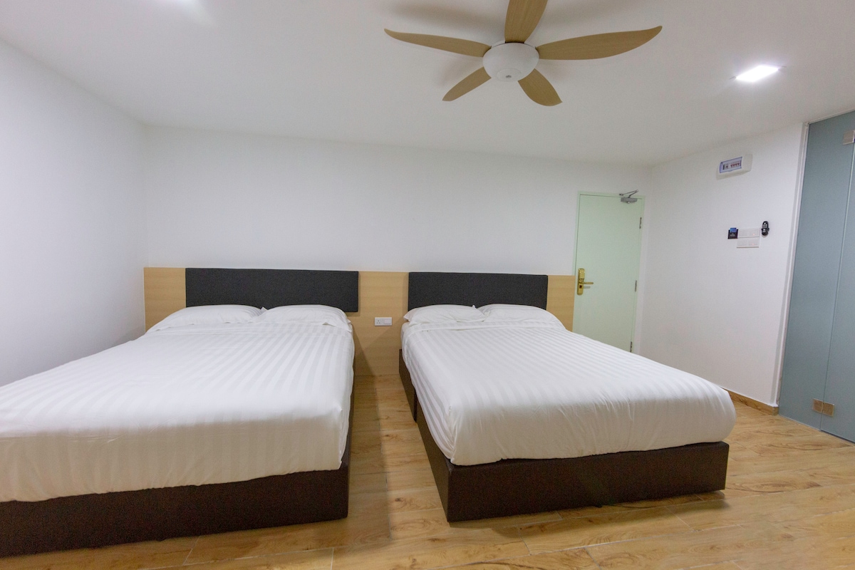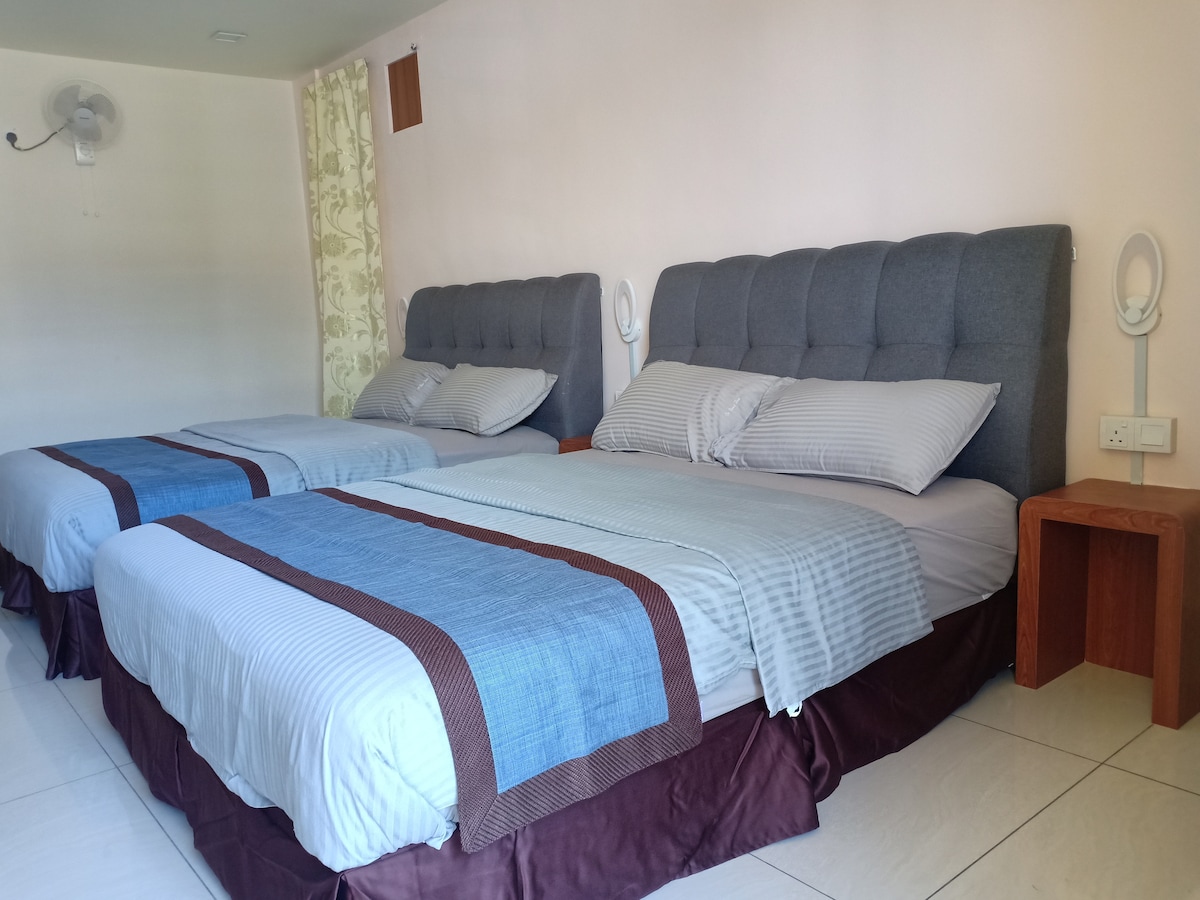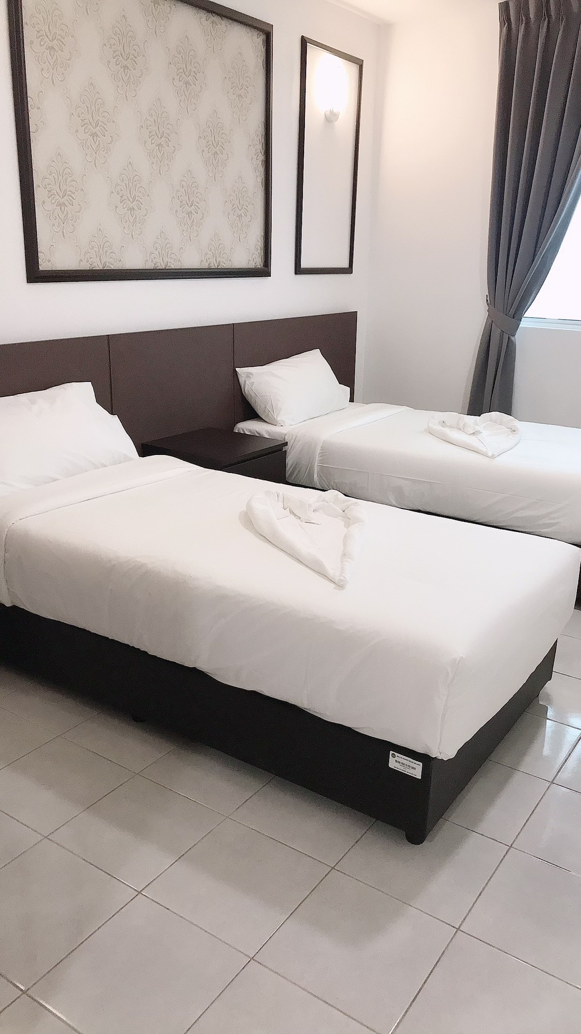 This hotel room comes with 1 King Bed, air-conditioning and has a private attached bathroom with hot shower. It can comfortably fit up to 2 guests, suitable for couples and friends. This room may be prone to noise as we are located beside a road junction, there is also a club behind our hotel. Please do not book if you are a light sleeper. Monthly stay available at 1700 RM nett per month
