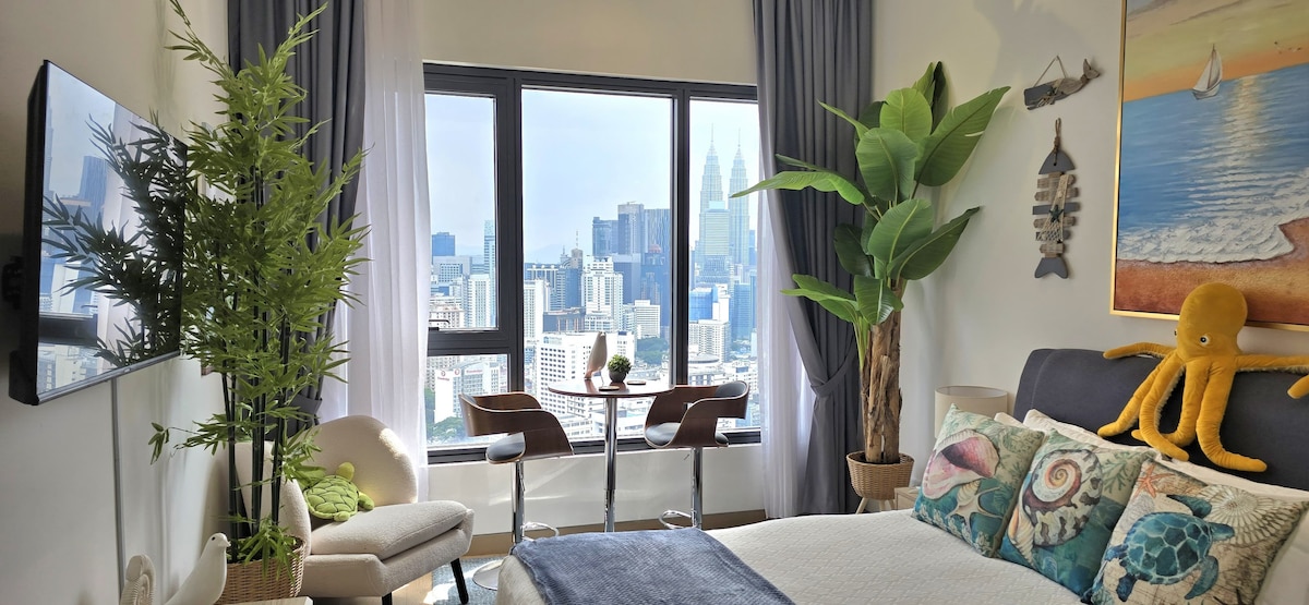 Why stay at Seashore Jr suite at Lucentia Residence - the best views of KL - beautifully decorated with a fun spirit - centrally located - near public trans - fast wifi - TV with Netflix, Apple TV, Prime Video - 2 gorgeous pools - family friendly with baby crib & high chair upon request - gym, pool table, BBQ pits, piano - garage parking - sleeps 2 max 3 - LalaPort Shopping Mall & the WOW entertainment street including grocery, drug store & many restaurants are attached - movie theatre GSC