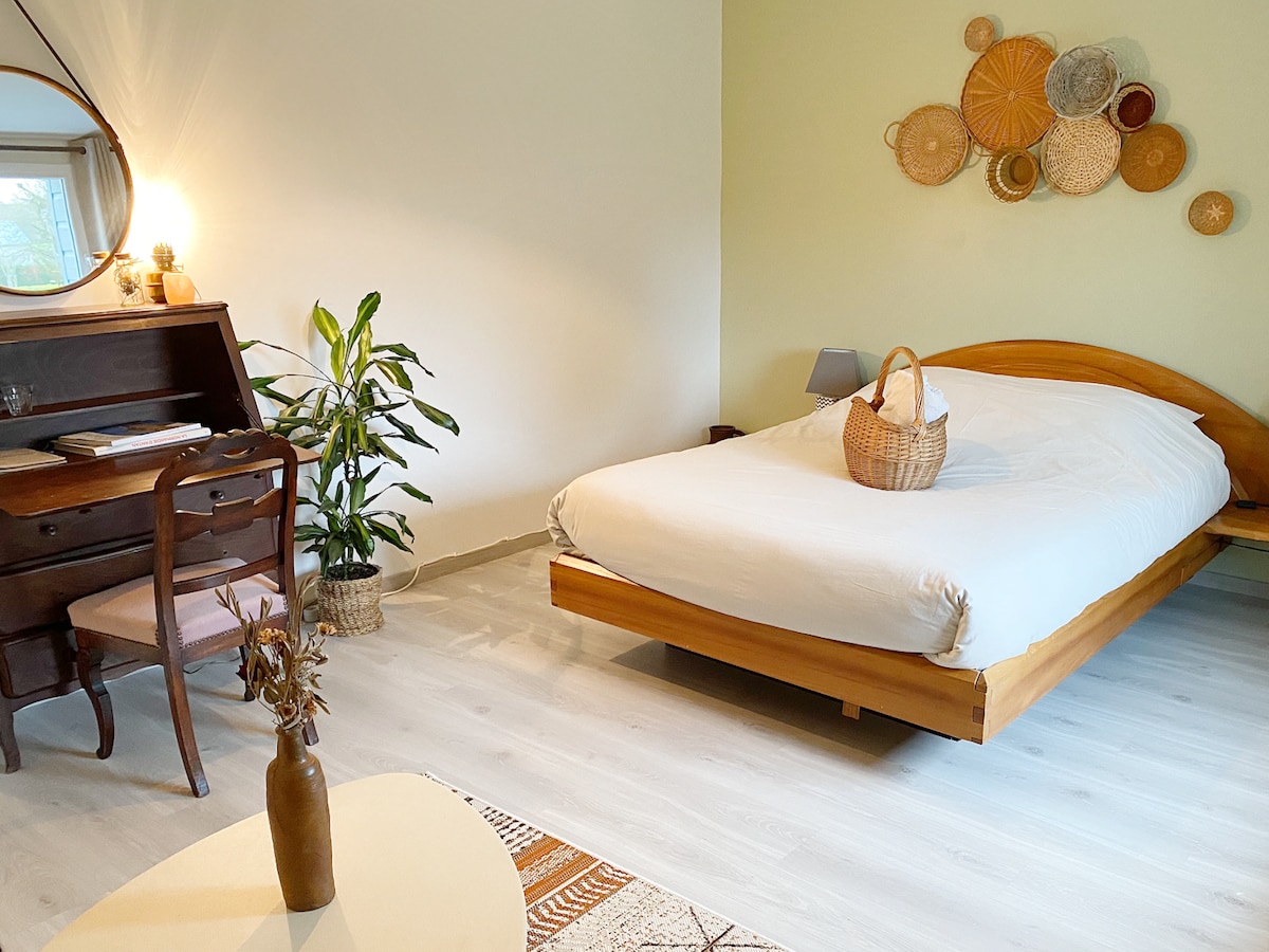 Détendez-vous dans ce logement calme et élégant. Entre le Mont St Michel/St Malo/Dinard/Dinan chambre spacieuse de 30m2 avec accès privatif et terrasse privée de 50m2 en hauteur avec vue sur le domaine. Lit King size, douche, linge et peignoir. Plateau de courtoisie/frigo/micro-ondes. Parking privé. Accès jacuzzi (commun aux autres hébergements . Accueil cavaliers possible avec paddocks. Petit déjeuner inclus/repas possible sur demande. Utilisez Waze pour une arrivée facile au domaine Tyg’ouest