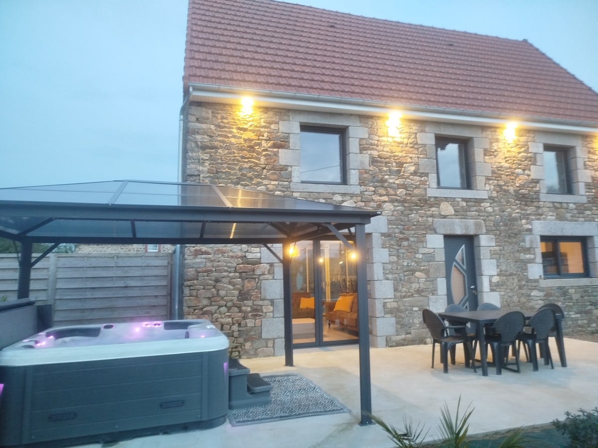 Maison 6 pers avec grand salon cuisine equipè 3 chambres 2 salles de bain de 90m2 et à côté du logement espace détente de 85 m2. Avec wc vestiaire douche. Sauna Hammam Jacuzzi et piscine avec nage à contre courant et Aqua bike entre Granville et villedieu les poêles. A 15 minDe la plage ,à 40 km du mont saint Michel à 5 min du zoo de champrepus. 2 h espace détente inclus dans le prix d’une nuit