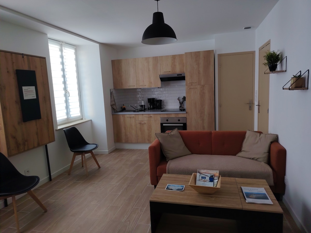 Studio spacieux et lumineux situé à Bréhal à 3km de la plage et 10km de Granville. Entièrement rénové et équipé, haut de plafond, c'est l'endroit idéal pour venir visiter la région et vous ressourcer. Tous les commerces se trouvent sur place. Jardin et cour commune sont à disposition ainsi qu'une place de parking. Marché au pied de l'appartement tous les mardis.