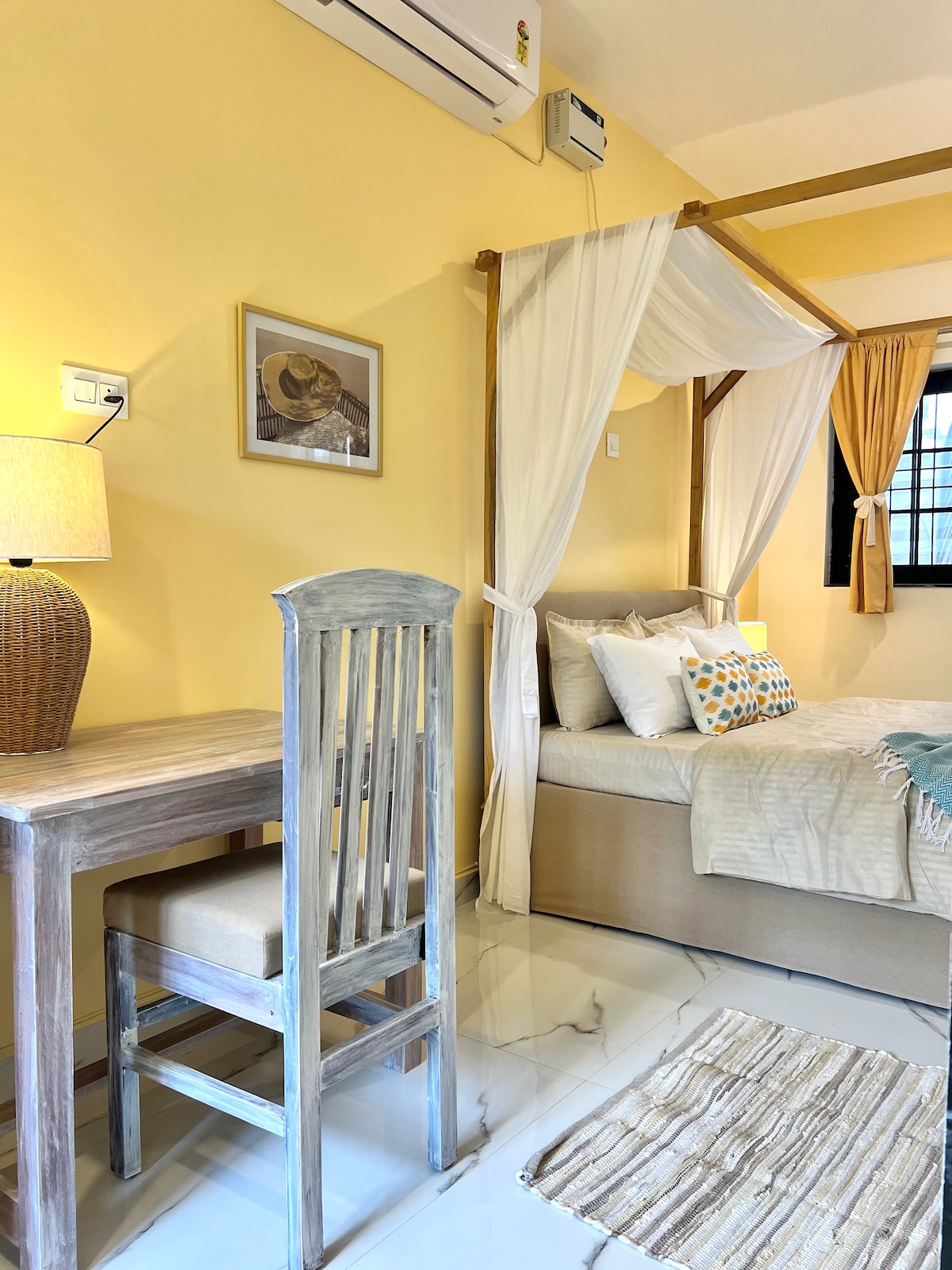 Welcome to The Odd Table, a slow-living space tucked away in Mandrem, Goa — where time moves gently, mornings smell of sea breeze, and conversations last a little longer. Each studio tells its own story through vintage décor, beach art, and posters from the ’60s. There’s a cozy reading nook with a collection of books, a kitchenette, a private bathroom, and the odd table- where tea, stories, and sunsets are shared. 🌞🌴