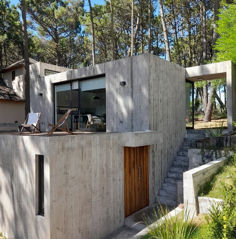 Casa moderna en altura, rodeada de bosque y tranquilidad. Amplia terraza y parque con parrilla y mesa de hormigón para disfrutar al aire libre. En la planta alta, ambiente único muy luminoso (living, comedor y cocina) con grandes ventanales y salida a la terraza. En la planta baja, dos cómodos dormitorios y baño completo. Cuenta con ducha exterior con agua caliente. Ubicada a 900 mts. del centro y 1000 mts. de la playa.