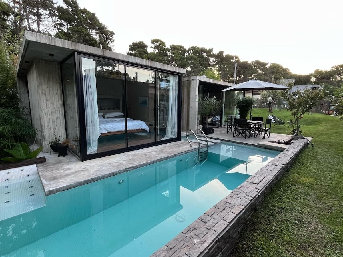 Experiencia premium de diseño en Mar Azul: casa moderna a 8 cuadras de la playa con piscina climatizada tipo spa (jacuzzi, cascada, nado contracorriente). Living-cocina integrado, suite con vestidor, A/A y piso radiante. Terraza y patio rodeados de bosque. Casa hecha y equipada por su propio dueño que tambien suele vivir ahi por periodos. No te faltará nada. Full equipado: Cocina super completa, Wi‑Fi, alarma, lavarropas, lavavajillas, vinoteca, sonido funcional y estacionamiento. Relax total.