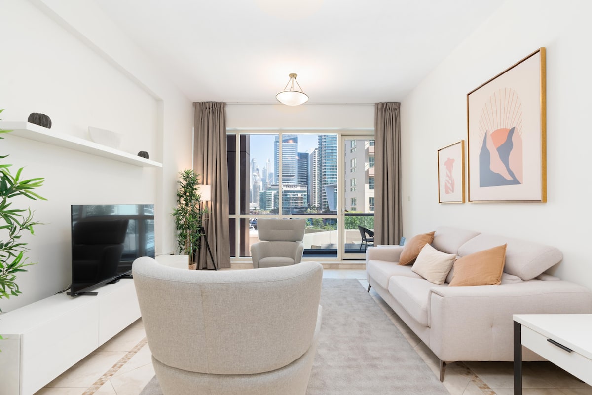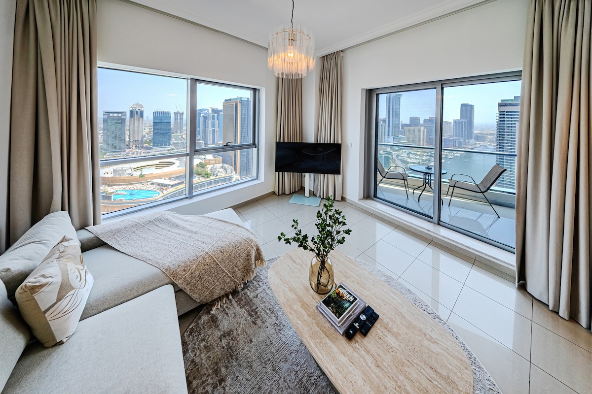 Experience luxury in our newly refurbished studio at JW Marriott Residences, Dubai Marina. Enjoy full Marina views, direct access to Dubai Marina Mall, and a sleek, modern design with premium finishes. Relax at the outdoor infinity pool overlooking the Marina, or stay active in the full gym. The space includes a plush king size bed, fast Wi-Fi, 65" smart TV, kitchen facilities, and luxury bathroom - perfect for both business and leisure stays in the heart of Dubai Marina.