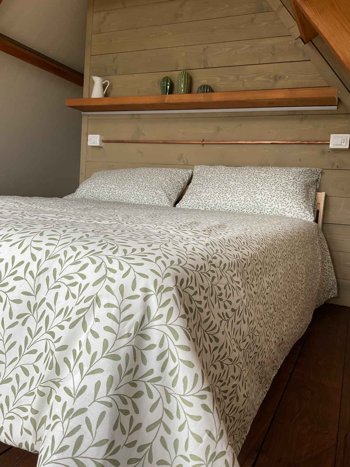 Under ancient trees in a wonderful landscape, there is a big cotton tent placed on a large wooden terrace, with a breathtaking view. The tent has a diameter of 5 meters and is equipped with a bed for 2 persons, 2 single beds (if needed), carpets on the floor, electricity and water. The tent is guaranteed to be waterproof and the thickness of the canvas offers sufficient protection against the wind. In front of the tent there is a large terrace with a table, chairs and deckchairs.