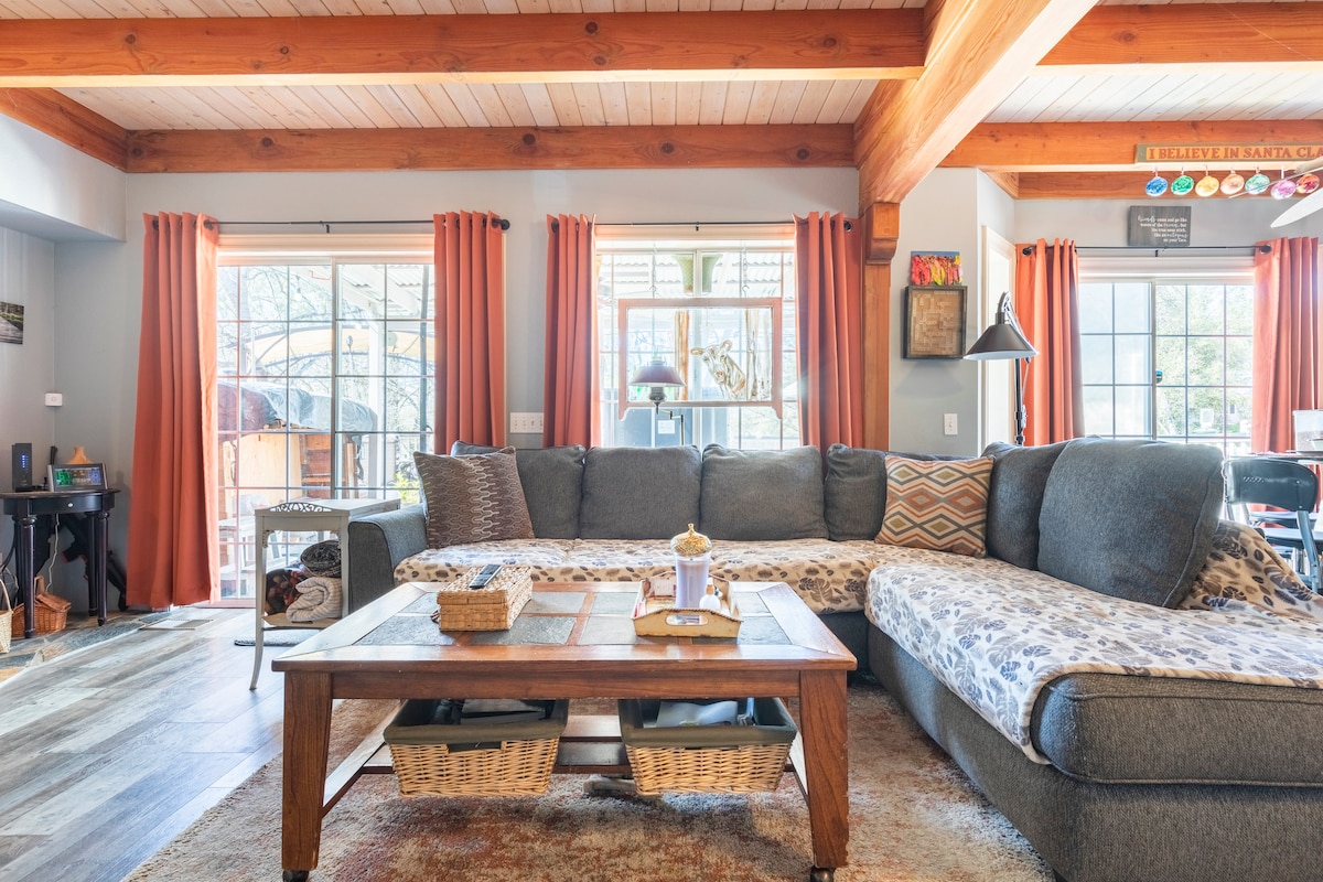 Nestled in the tranquil beauty of nature, this custom-built home combines rustic charm with modern sophistication. Accessibility improvements have been made to ensure that everyone can enjoy our Mountain Retreat, regardless of mobility. As you enter the home, you’ll be welcomed by a living room with a high vaulted ceiling that fills the space with natural light and offers stunning panoramic views of the surrounding mountains. The tasteful decor contributes to a warm and inviting atmosphere.