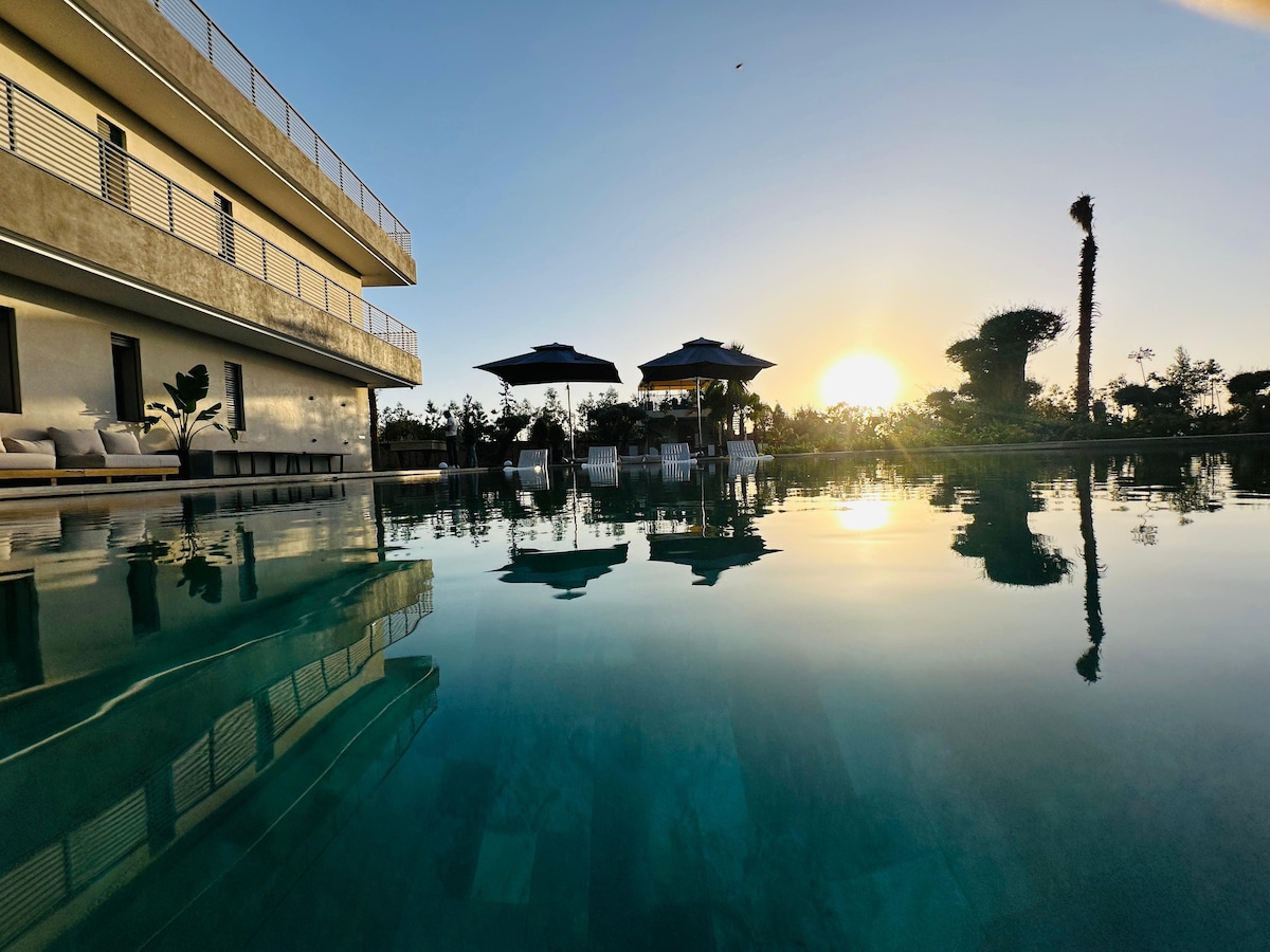 ☀️ Beautiful villa with private pool and rooftop overlooking the Atlas Mountains, just minutes from Marrakech city center. Located in a secure, high-end residence with golf course, private beach and many activities (wake park, tennis, pool, restaurant). A peaceful haven for up to 6 guests, with a 2000L water tank ensuring comfort during occasional summer water cuts in Marrakech. Perfect for a relaxing and serene getaway.
