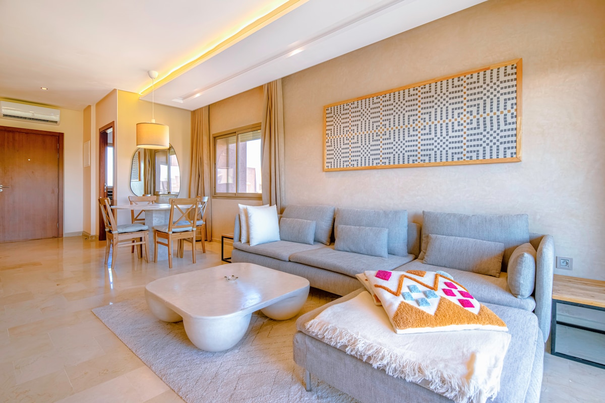 The Prestigia apartment is now part of the Holidays Family group. Treat yourself to a memorable getaway and discover a peaceful and luxurious retreat nestled in the vibrant heart of Marrakech. The apartment welcomes you into a haven of tranquility where every detail invites relaxation. Its refined decor, warm colours, and delicate fabrics create a unique and elegant atmosphere. The apartment is ideally located at the heart of a golf course, with a private garden and stunning views of the pool.