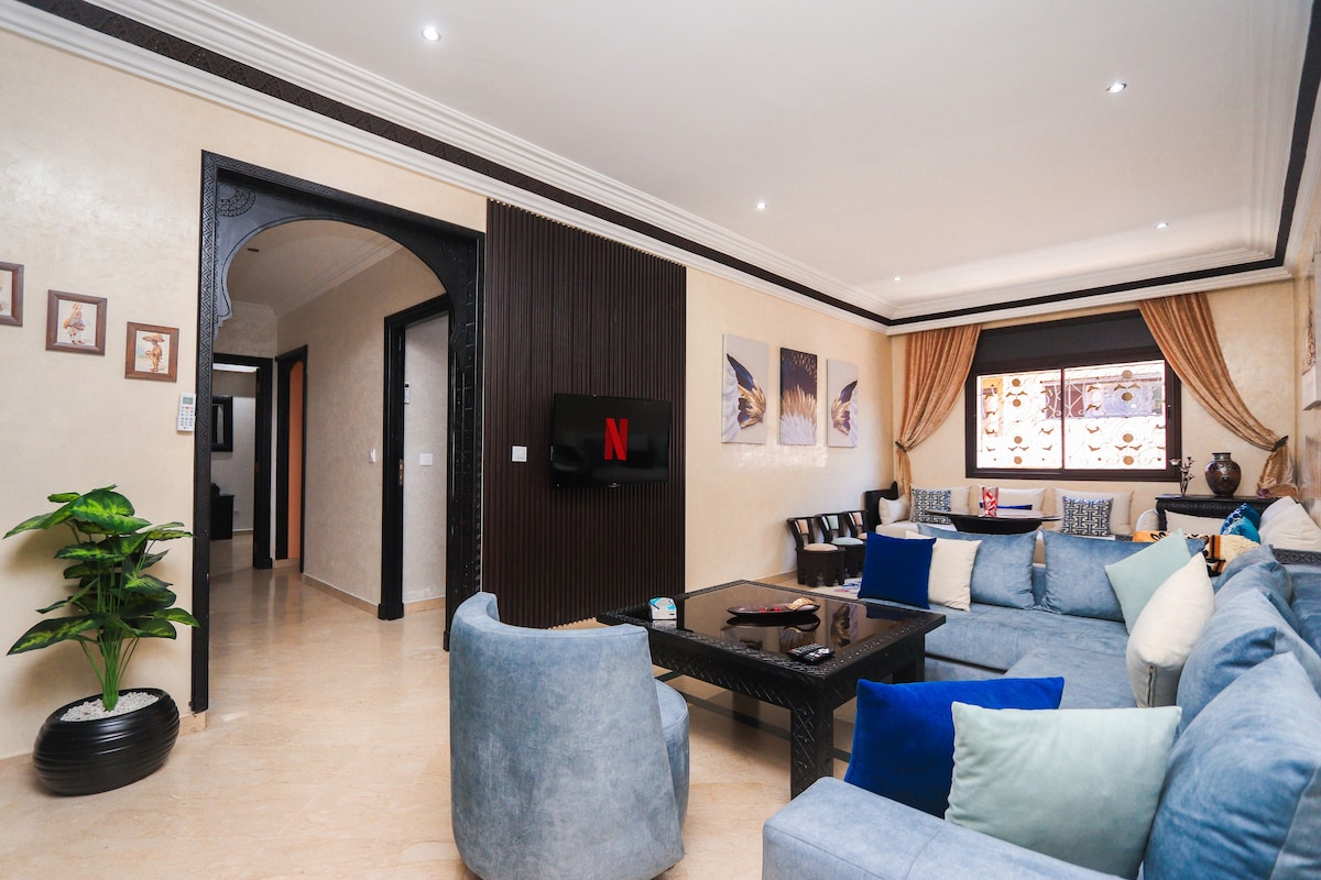 ✨ Séjour d’exception au cœur de Marrakech. Appartement de prestige situé à Hivernage, dans une résidence sécurisée avec piscine et parking privé. Profitez d’un cadre élégant mêlant charme marocain et confort moderne, avec salons traditionnels et décoration soignée. Balcon ensoleillé avec vue sur la piscine, literie haut de gamme, climatisation et propreté irréprochable. Emplacement idéal pour découvrir Guéliz et la Médina tout en profitant d’un séjour chic et relaxant.