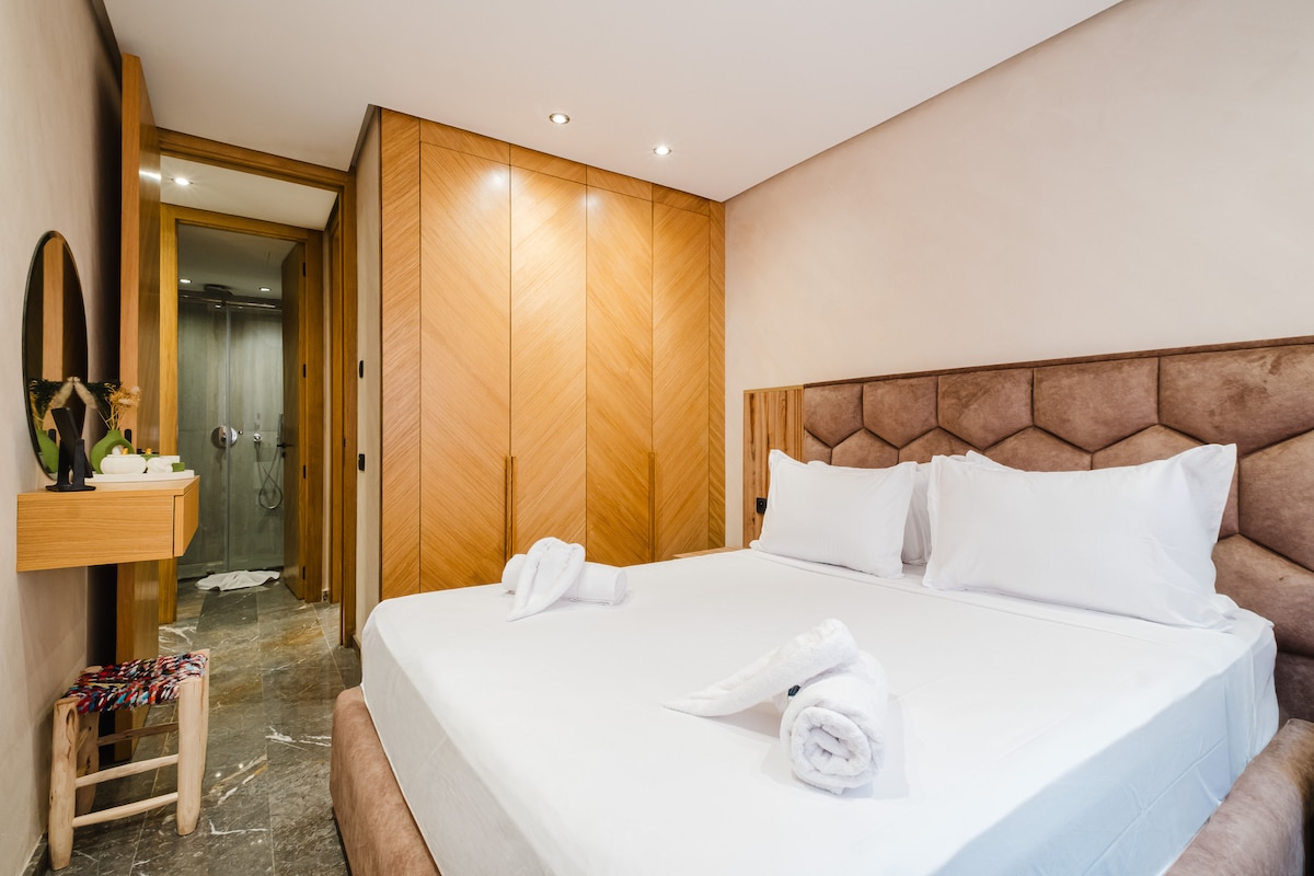 Séjournez en plein cœur de Marrakech dans notre appartement 2 chambres et 2 salles de bain. Profitez d'Une literie Simmons haut de gamme, WiFi haut débit (fibre optique) et d'une décoration moderne avec un bassin privé. Cuisine entièrement équipée, baignoire élégante, et douche italienne. À quelques pas de la place Jemaa el-Fna, du Plazza, et du Carré Eden. La piscine n’est pas chauffée. NB: Les couples marocains non mariés ne sont pas autorisés.
