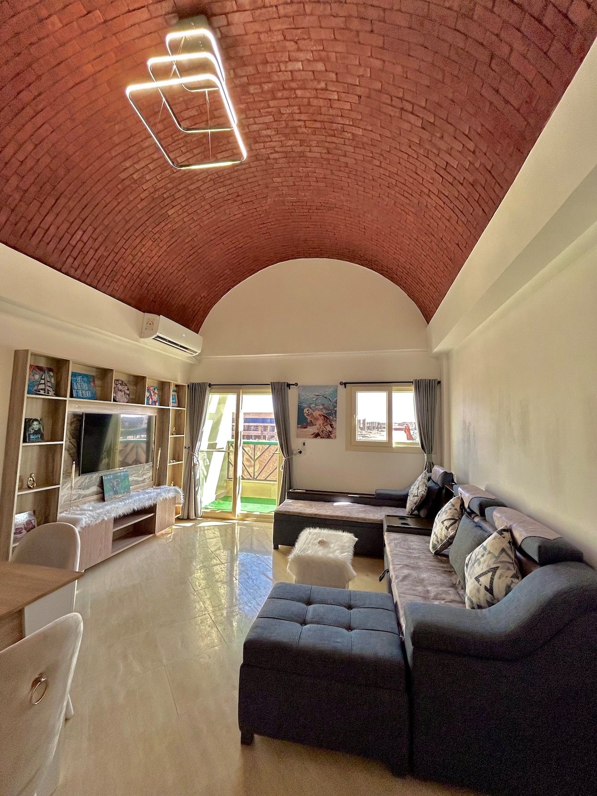 1 Room apartment at unique location of OrientalCoast MarsaAlam , "PLEASE NOTE" 100km north of Marsa Alam village, with access to the hotel & all its facilities (Pool/Beach/Animation etc. free). FREE access to private beach, as well as Club House with private poo.. 24/7 service from house owners. Market just 300m away. Walking to beach 3-4min. Arabic Style with dome on 2nd Floor with Sea & Desert view. Full furniture, wash machine etc. (small fridge). Wi-Fi available through Sim card with 10GB.