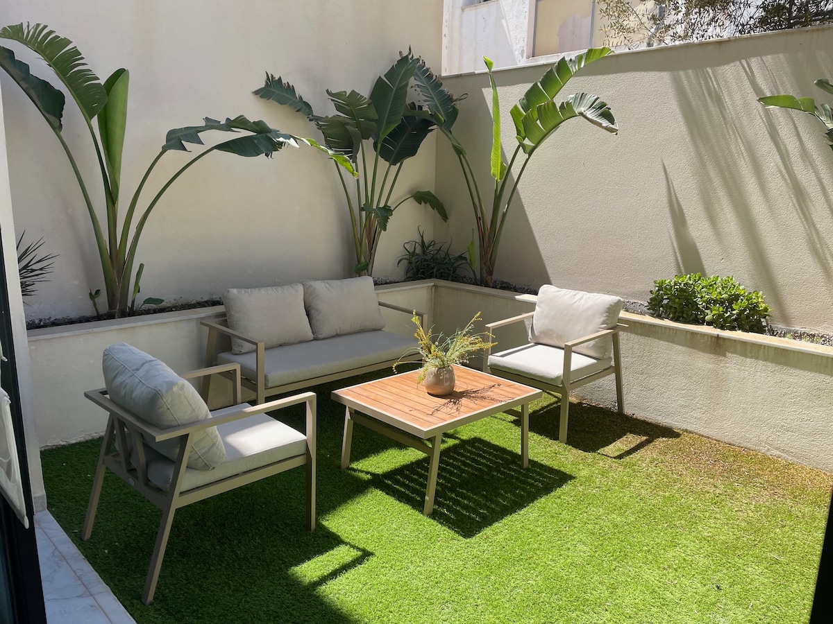 This small studio with private terrace decorated in a hotel suite style, composed of a separate bedroom and a living room, is ideally located at Marsa Corniche: a stone's throw from the beach, all shops, good restaurants, train... everything is accessible on foot and in complete safety! Sidi bou said, Carthage, Saf Saf and the market are also nearby. The little extra: To make your stay as pleasant as possible, we have tried to think about all the details for an original and chic experience.