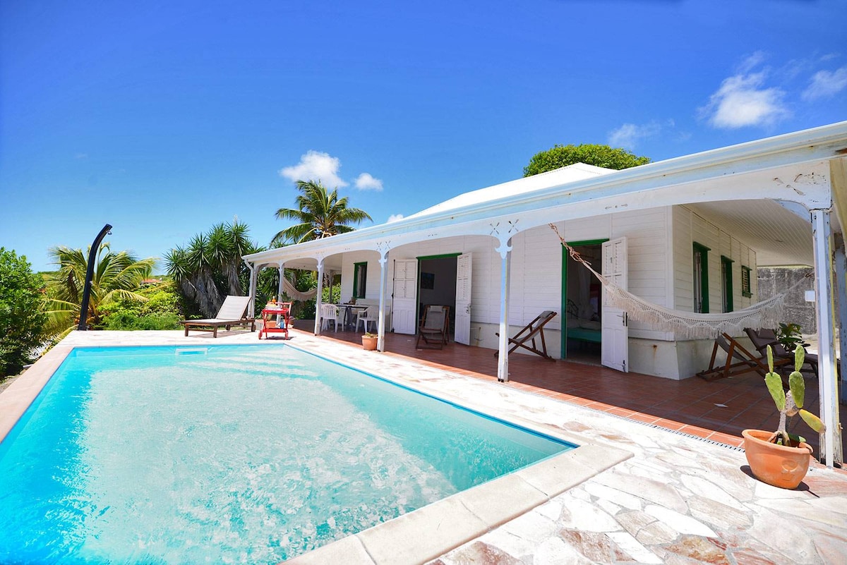 Maison + piscine carrelée (reflets rivière) dominant la plage (2mn à pieds), facile d'accès, dans la verdure. Le bruit des vagues sans le sable dans le lit... Magnifiques vues sur Rocher du Diamant et campagne. Calme, 50m de la plage, qq minutes du bourg, sur un domaine familial privé et sécurisé (portail à digicode). Environnement très privilégié! Une Wifi au top avec antenne Starlink Déco simple et nature, 3 chambres climatisées, 3 SDB +2 canapés dans le salon (2 lits sup). Lit Graco/Bb