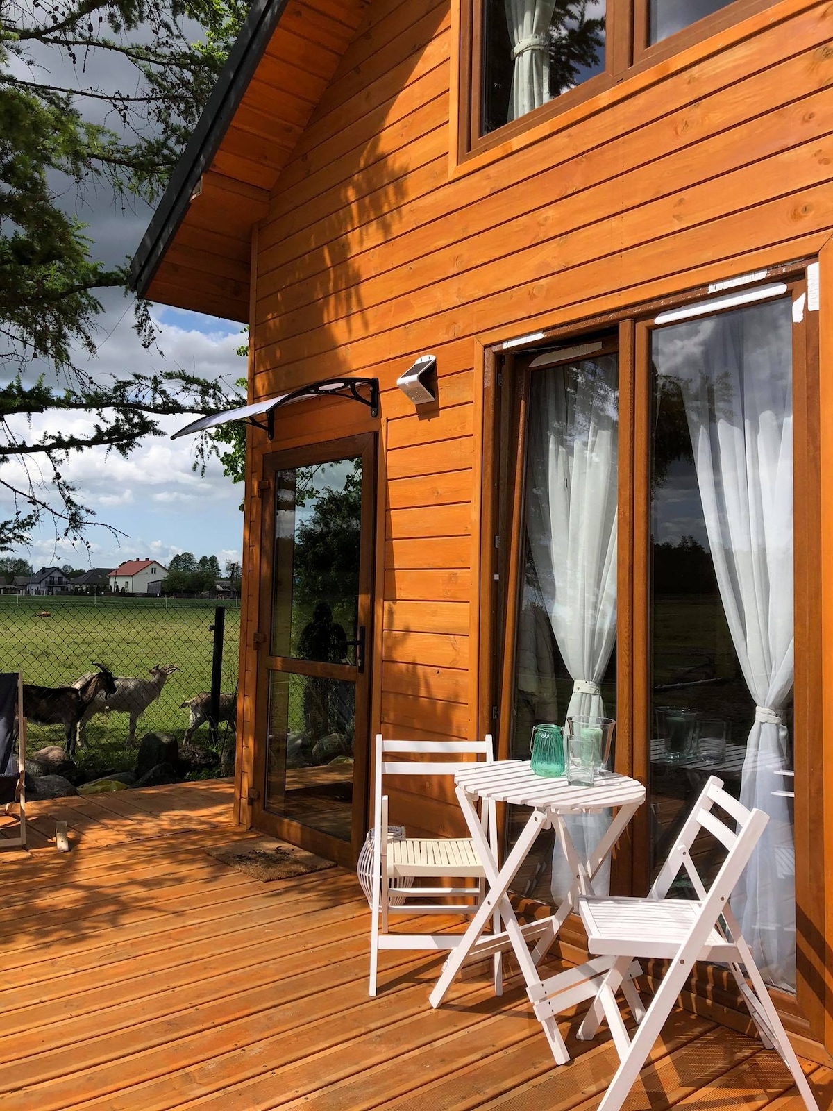 Prezentacja video https://youtu.be/HvZ-B8C6-8s Do dyspozycji gości przekazujemy nowy domek położony w malowniczej scenerii mazowieckiej wsi. Dom mieści się na terenie gospodarstwa agroturystycznego gdzie mamy możliwość bezpośredniego obcowania z kozami, kucykami, końmi i innymi zwierzętami gospodarskimi. Dwu piętrowy domek został wykonany w pełni z pachnącego drewna sosnowego, dodatkowo ocieplony-wygłuszony oraz urządzony w nowoczesnym stylu z elementami retro.