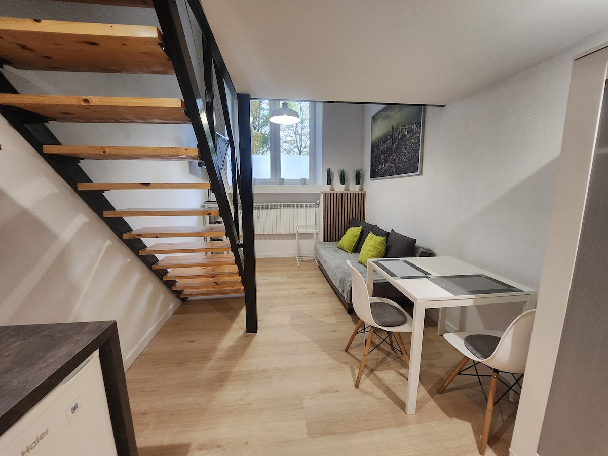 Very nice apartment. There is a kitchen with a living room, bedroom, bathroom and a balkony. Behind the building there's a small forest as well as a nice park. Around 200 m from the appartment there's a shopping mall and a cinema. For guest use there`s a undergrung car park with dedicated place. In the kitchen for comfort f guest there are basic kitchen staff like coffee, tea, sugar, salt, oil, spices etc... Night silence applies between 22.00-06.00 so it`s not adequate for parties.