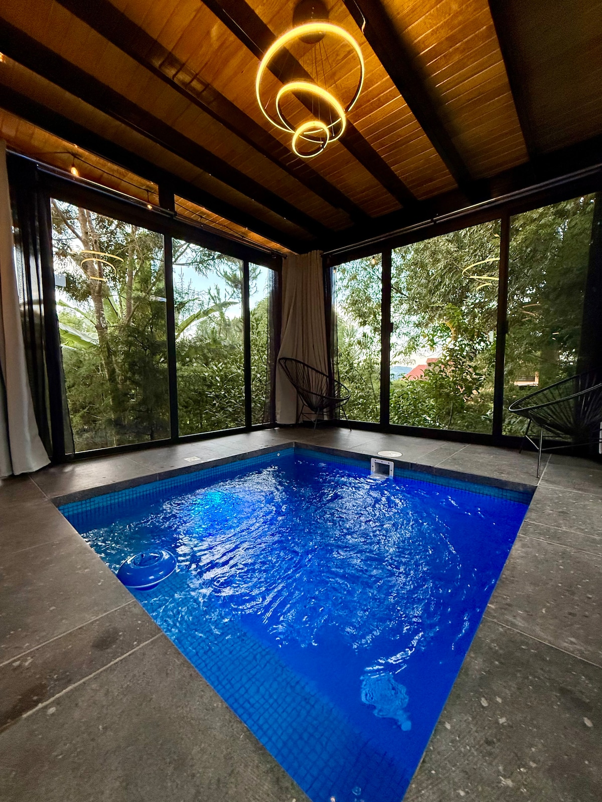 Tiene una vista espectacular al bosque con acabados de lujo, modernos y podrás disfrutar de sus amenidades como jacuzzi en la terraza, chimenea interior y fogatero exterior, así como desconectarte del ruido de la ciudad y conectar con la naturaleza