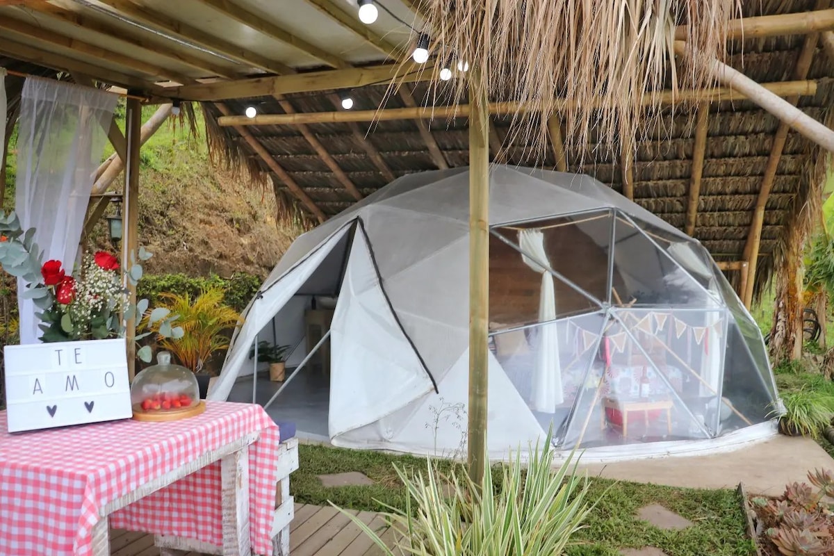 Hermoso Domo - Glamping ubicado junto a reserva natural. INCLUYE: Cama King• Cocina equipada• Baño privado• Agua Caliente• Jacuzzi privado• Sofá y escritorio• Deck con mobiliario• Televisión• WiFi 300 MBP• Fogata autoservicio• Asador-BBQ a gas• Parqueadero gratis. COMIDA PARA PREPARAR O DE RESTAURANTE, LICOR, MEDICINA Y CASI CUALUQIER COSA SE PUEDE PEDIR A DOMICILIO Y LO LLEVAN HASTA LA PUERTA DEL GLAMPING. RNT: 162437
