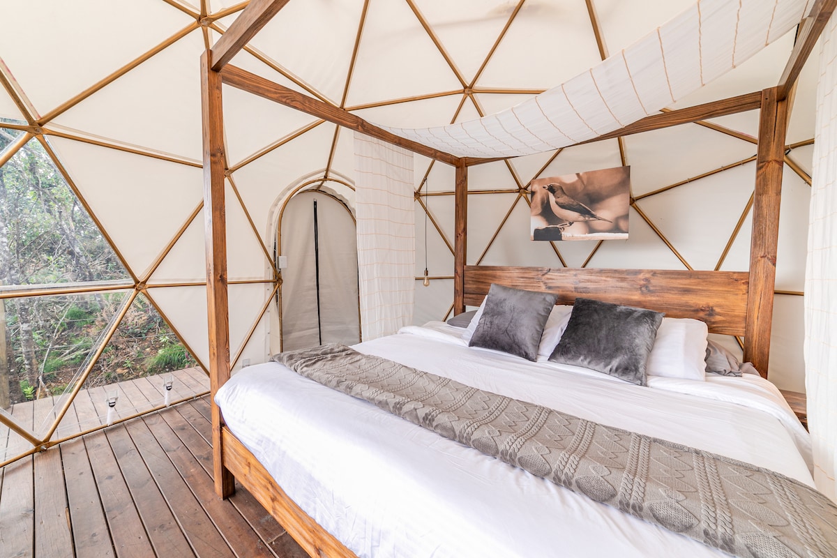Alojarte en nuestro Domo Aguamarina es sumergirte en la calidez de la madera y en la armonía de la luz natural que llena el espacio de brillo y serenidad. Un refugio que invita al silencio, la calma y a un descanso verdaderamente reparador.