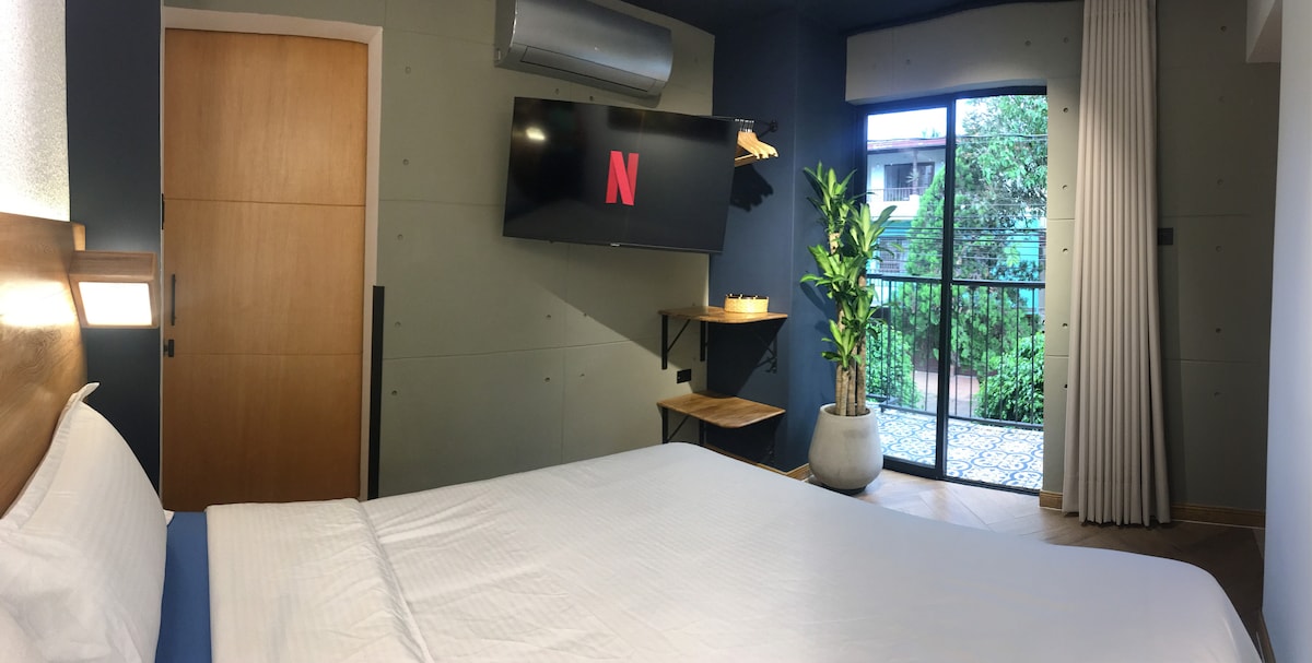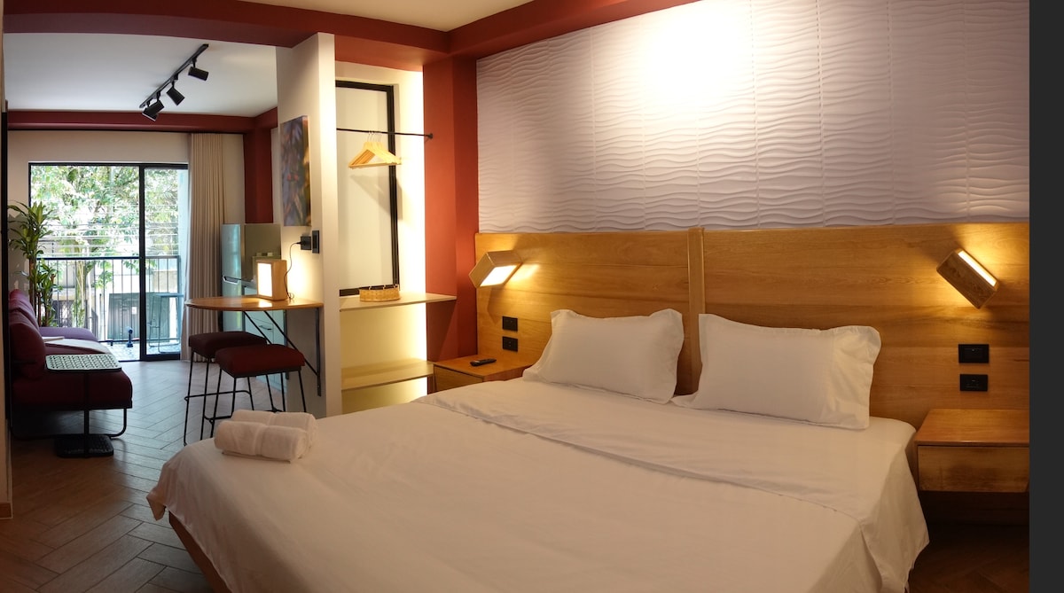 This place is not to be missed. We have 1 bedroom 1 bathroom with a jacuzzi, light decor and a 55'' HD TV. This Hotel is perfectly located within 2 blocks of Parque Lleras. Within a few mins walk from the best Restaurants in Medellin like Carmen, El Cielo, IL Castello and Hanami. If you want to be in the heart of the action where the locals hang out this is the place to be Everything you need is at a few steps reach.