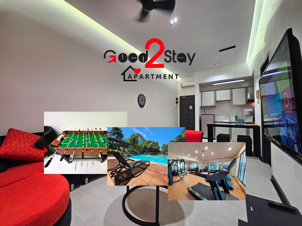 Good2Stay Apartment -Accommodate from 2-4 pax -1 Bedrooms & 1 Bathrooms (tub) -FOC 1 CarParking -Coway Water Dispenser -Wifi6 100-300mbps -Football game table -Shared Pool (Ground Floor) -Shared Gym (Ground Floor) -Shared Playground (Ground Floor) -Convenient Mart (Ground Floor)