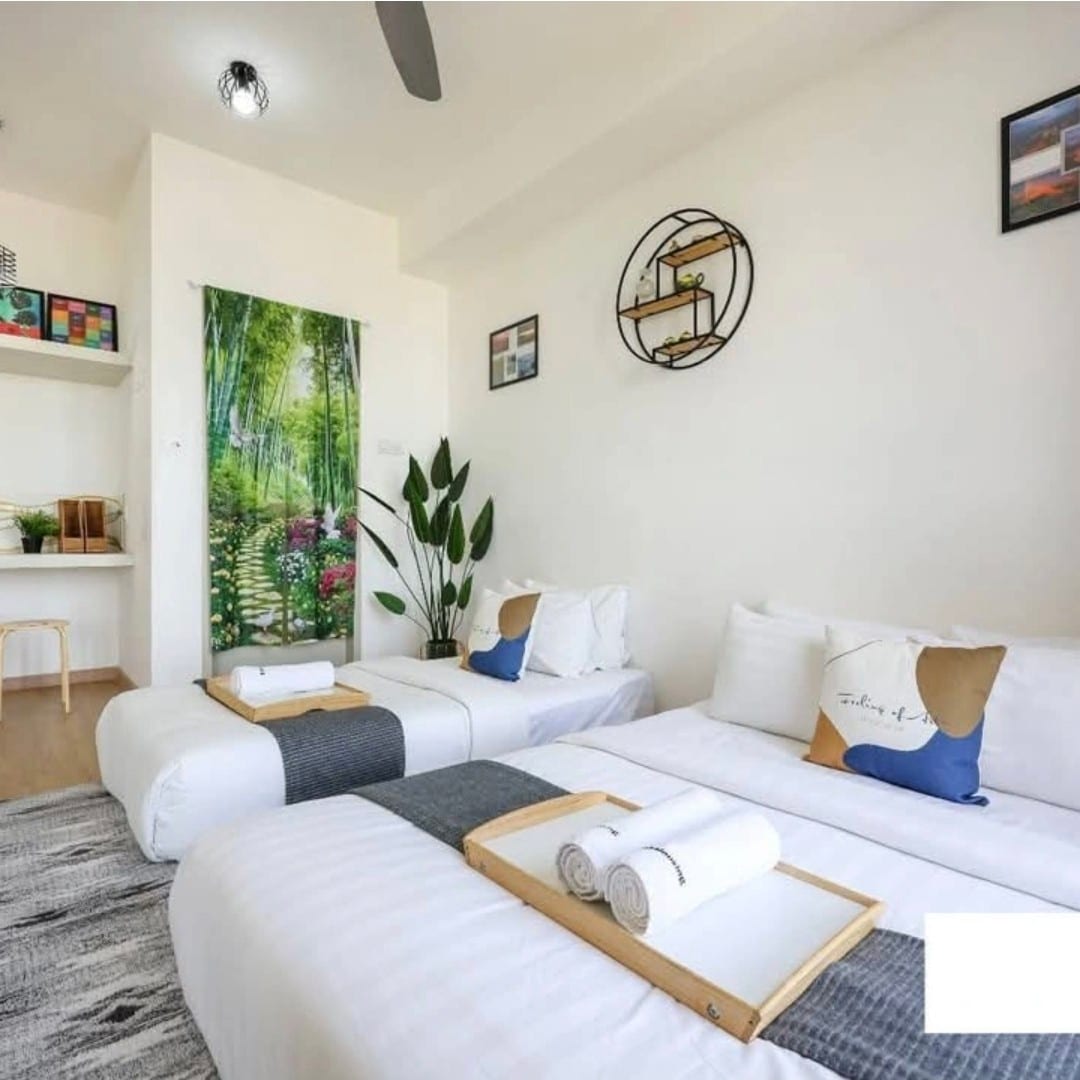 How many pax can stay here: Apartment can accommodate 4 pax and still comfortable for 6 pax. It's located in the heart of Melaka City and just 3 km away from historical building A'Famosa and Studthuy's Building. Facilities: Provide FREE parking lot for 1 car at level 2. Others can park at the ground floor. List of amenities that provided within the house: This stylish apartment also come with 2 queen-size beds & 1 queen-size foldable sofa bed, 1 extra toto, 60" LED android TV, WI-FI, etc.