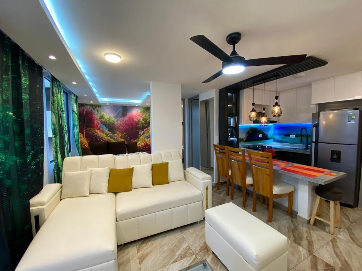 Apartamento amoblado para una capacidad de 6 a 8 huéspedes con toda la comodidad, cuenta con cortinas tipo blackout para facilitar el descanso y limita el ingreso de rayos del sol y calor. 2 aires acondicionados balcon dotado con BBQ 2 televisores pantalla plana led Netflix Licuadora Lavadora