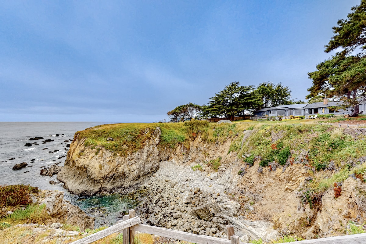 NEW REMODELED!! Welcome to Pebble Palace! Our beautiful, OCEANFRONT home is comprised of 3 bedrooms/ 2.5 baths, panoramic ocean views & a hot tub! Located in the lovely town of S Caspar, just a 5 minute drive from Mendocino Village! Walk to the beach, hiking trails & lighthouse! Pebble Palace is perfect for guests on romantic getaways, wine country trips, beach getaways, wine country trips or families that desire the amenities of a hotel but with the space of a home right in the ocean.