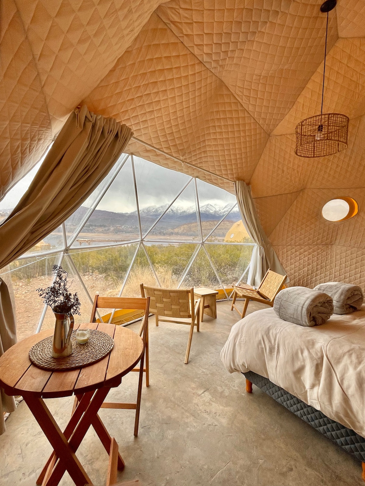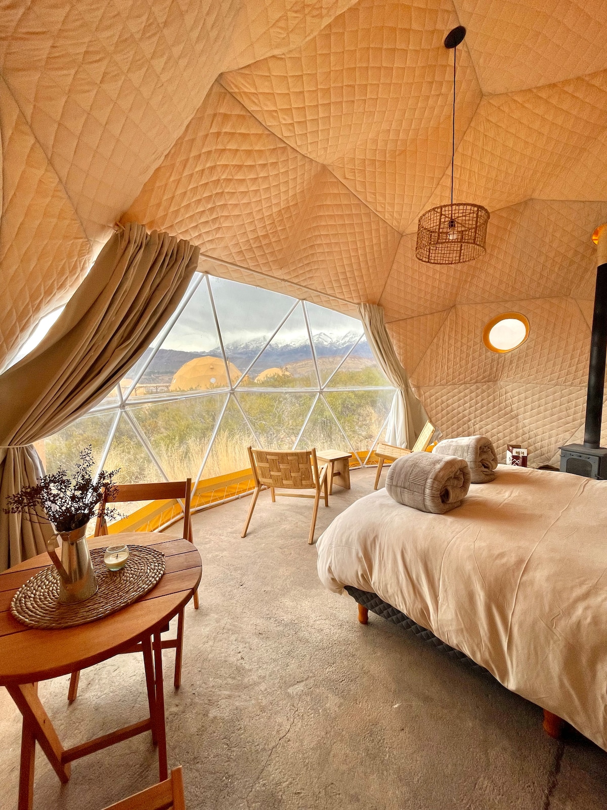 Domo de Lujo en la Base del Cerro Aconcagua. Todas las comodidades del glamping para que tu disfrutes tus experiencias de trekking o ascencionismo en el Aconcagua. Alojamiento calefaccionado a leña con piso de madera camas de primera línea y unas vistas impresionante de la pared oeste de la montaña. Este espacio es único y hará que recuperes tus fuerzas descanses y puedas disfrutar de una experiencia inolvidable a 4270 metros sobre el nivel del mar.